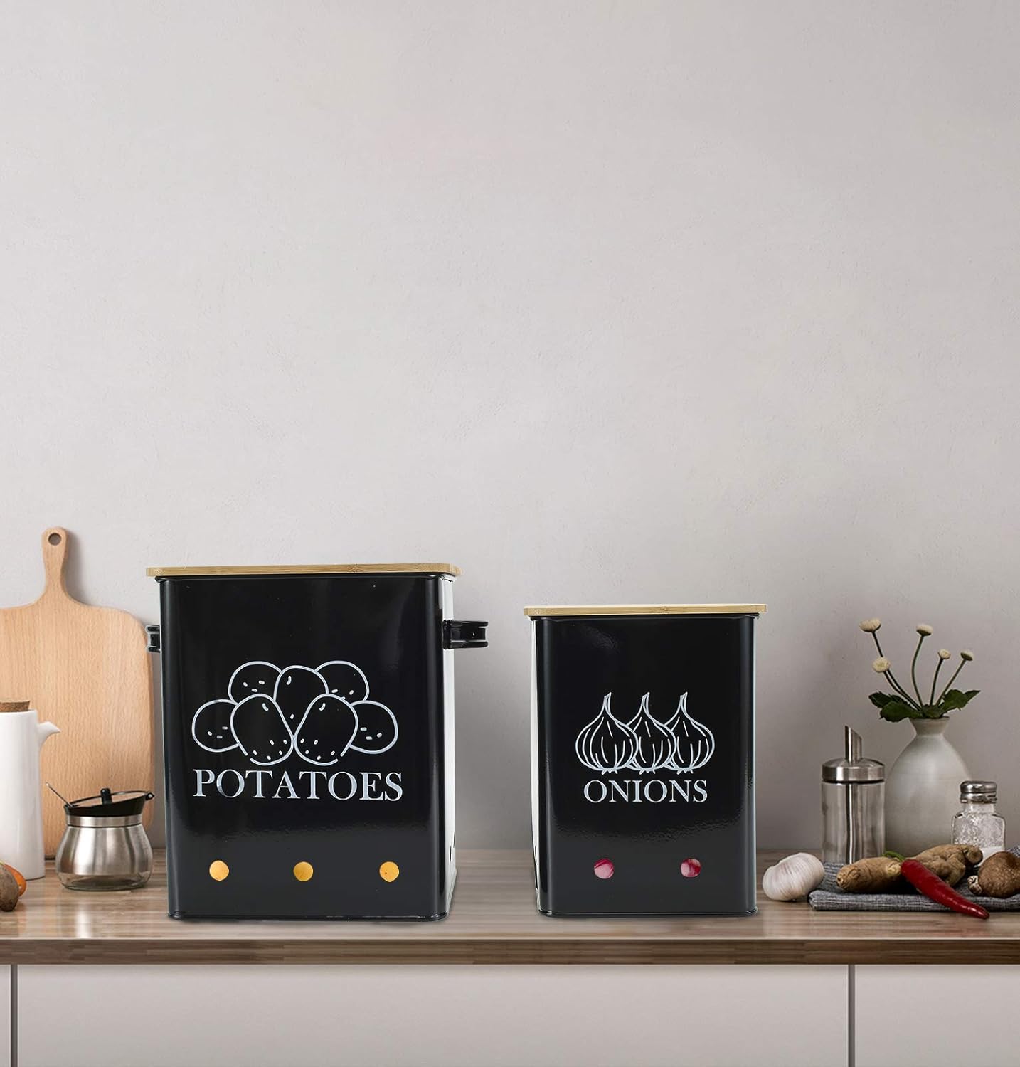 Kitchen Vegetable Storage Tins Set of 2 for Potatoes, Onion, with wooden lid Garlic Bin Caddy, Long Shelf Life-Black