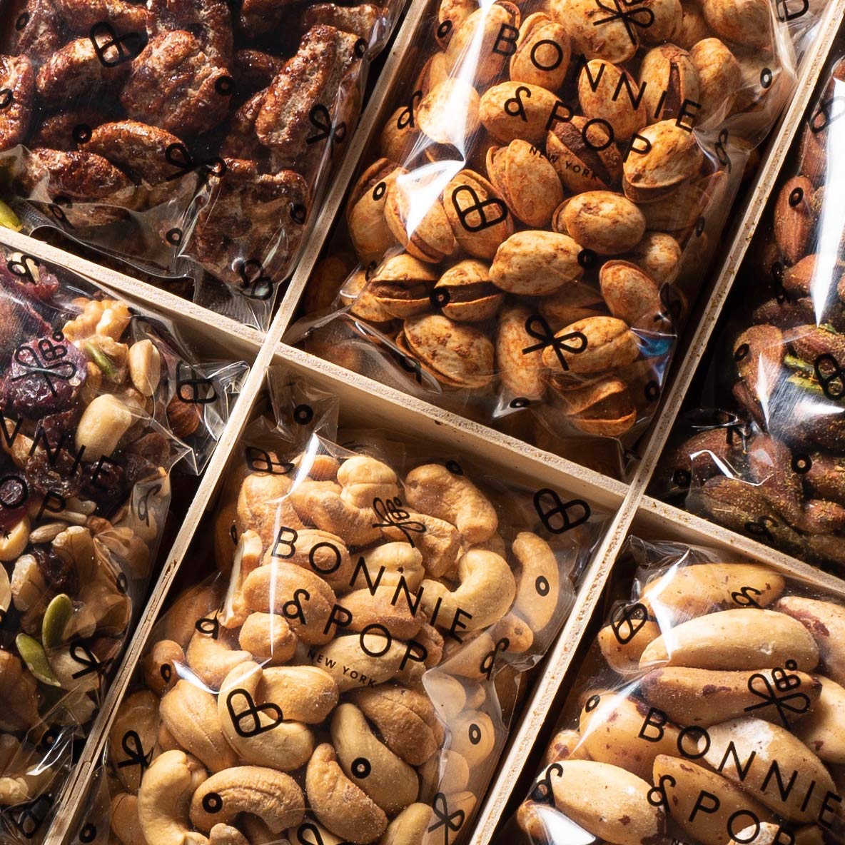 BONNIE AND POP - Nut Gift Basket | Healthy Gift of Assorted Nuts in Reusable Wood Crate | Large Variety Tray with Unique Flavors | Parties, Holidays, Birthday, Sympathy, Office, Thank You, Him, Her | Bonnie & Pop