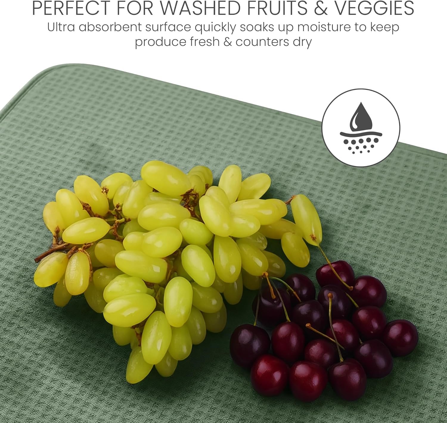 - THICKEST , STYLISH MAT | INNOVATIVE HONEYCOMB WEAVE: Keep your counter spotless even while washing a sink full of dishes . Our superbly stylish drying mat is among the thickest on the market today , and its innovative honeycomb microfiber structure enhances absorption and quickens drying time .