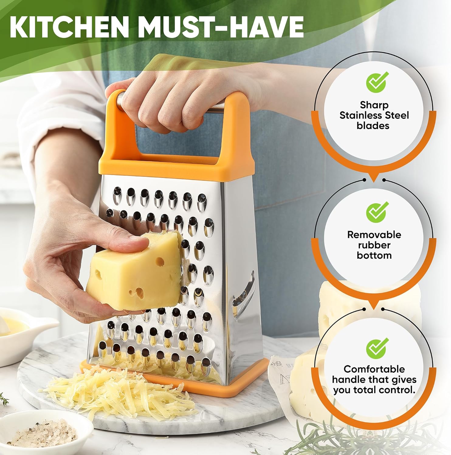 - Incredible Versatility With The 4 Sided Design: Consider getting rid of all the other graters and slicers you may own to make room for this. Coarse grating, Medium grating, Fine grating/Zester and even a Slicer - all in one convenient tool. Quickly prep an array of foods like cheese, potato, squash, zucchini, carrots, lemons and cucumbers. Multi-functional manual cheese grater with a comfortable handle that gives you total control.