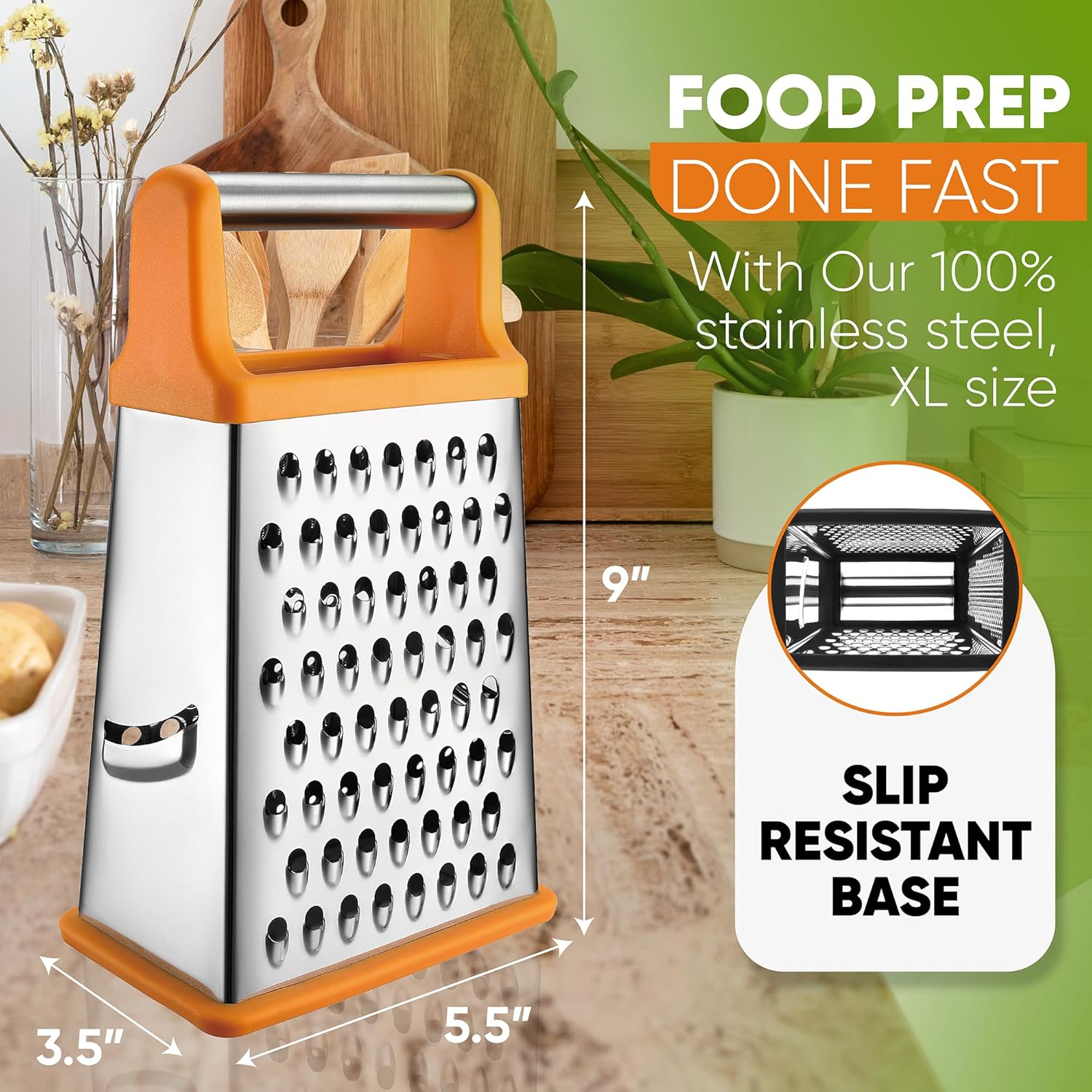 Spring Chef Handheld Stainless Steel XL Parmesan Cheese Grater with Handle - 4 Sided Manual Box Grater for Kitchen - Dishwasher Safe Cheese Shredder for Carrot, Potato, Vegetables, Hash Brown - Mango