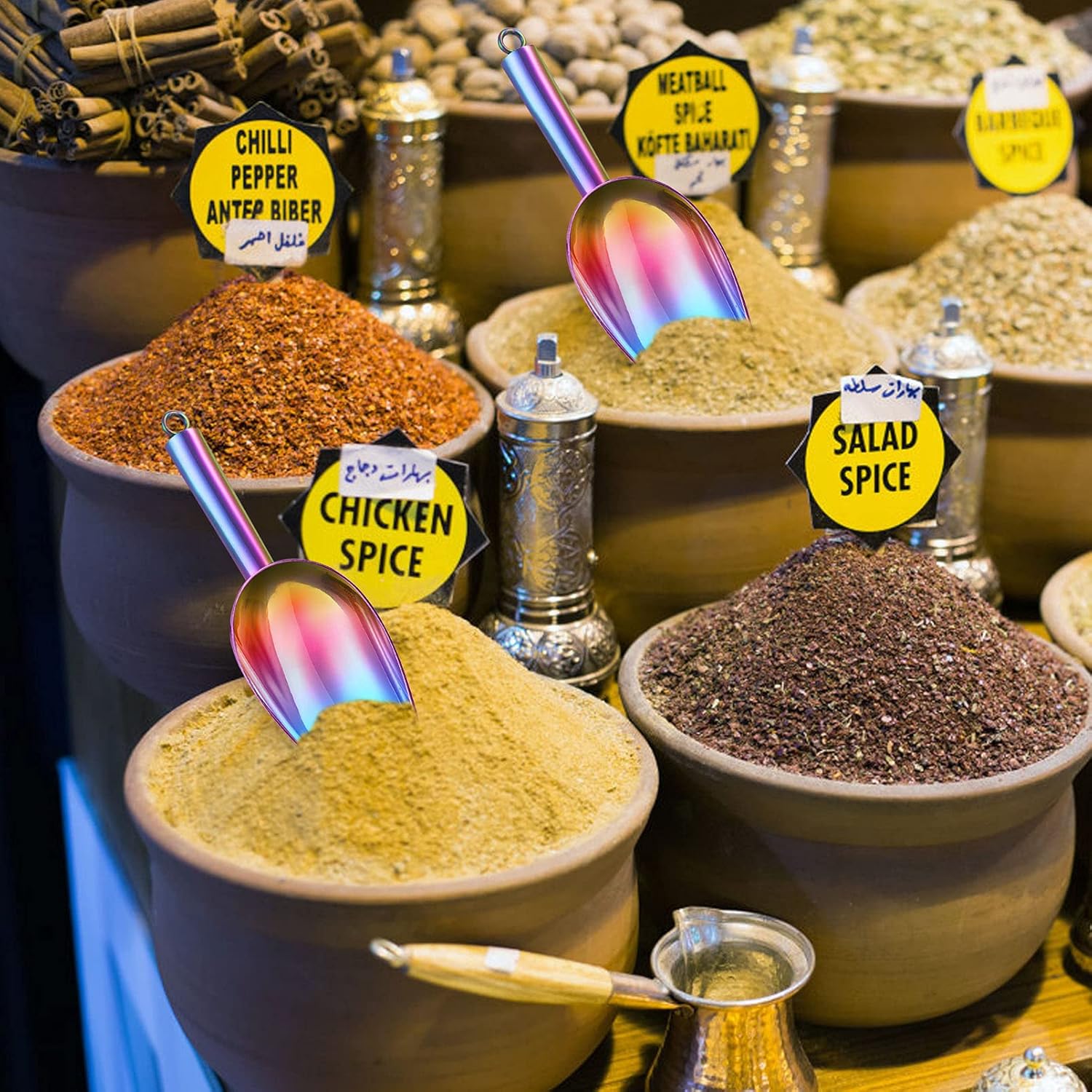- Multi-Purpose: 5oz metal scoop, Overall length 8 inch, Bowl 4.5’’ L x 2.7’’ W x 1.5’’ H, Compact size to scoop from small bins or containers, 2 pcs meet different uses to scoop ice cubes, coffee beans, grains and flour at the same time