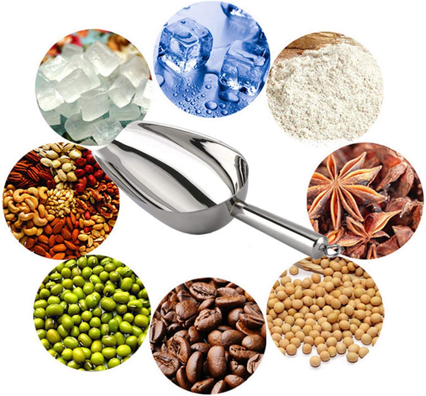 - Versatile: 5oz metal scoop, Overall length 8 inch, Bowl 4.5’’ L x 2.7’’ W x 1.5’’ H, Compact size to scoop from small bins or containers, 2 pcs meet different uses to scoop ice cubes, coffee beans, grains and flour at the same time