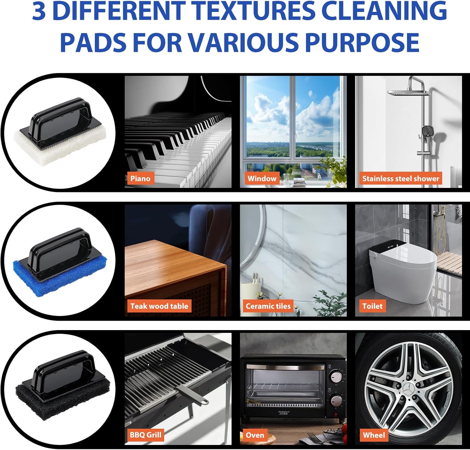 - PERFECT CLEANING KIT FOR EVERY SURFACE features three distinct pads (fine, medium, coarse), designed to handle a range of cleaning tasks from delicate to heavy-duty, work great on piano, glass, stainless steel, vinyl, teak, ceramic, wood, boat bottom, wheel and aluminum etc.