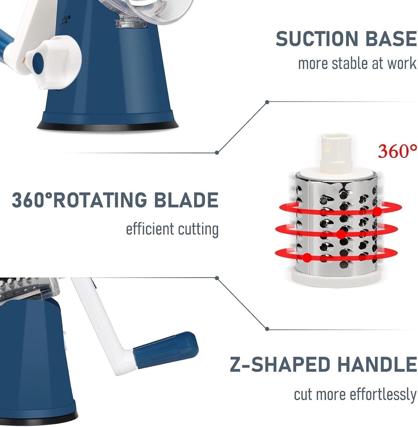 - 🧀Humanized Design: Reasonable drum-type rotating vegetable shredder has powerful suction feet for stability on your table. The rotary cheese grater with handle is very efficient and easy to operate! The parts can be easily disassembled, which makes the cleaning more convenient and simple. It also saves storage space and makes your kitchen cabinet less crowded.