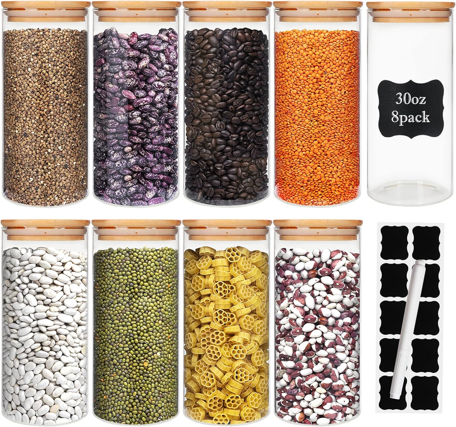 - Value Pack: 8 pack 30 oz/ 890 ml glass storage containers with airtight bamboo lids, water-resistant labels and chalkboard pen