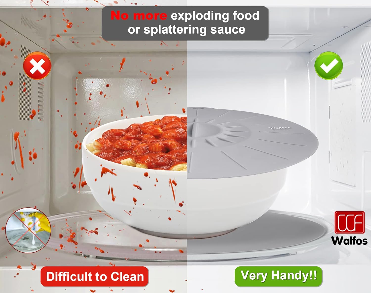 - 🍲PERFECT COMBO FOR MICROWAVING --- Walfos Microwave Mat and Microwave Cover set is made of food grade silicone. BPA free, flexible and persistent. The microwave cover as a splatter guard ,prevent overflow in the microwave. Microwave mat as a hot trivet Great saver of burned hands and spilled hot food when bringing the dish directly to the table.