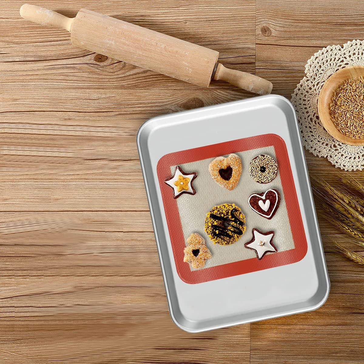 - 【MULTI-PURPOSE】This square baking mat is mostly ideal for toasting and baking bread, cakes, macaron, pastries, tortilla, jellyroll, baked cookies, or other baked foods. You can also use it as a pan/bowl/sheet mat, rolling mat, cake pan liner, pastry mat, pizza liner, or even small cooktop mat and place mat.