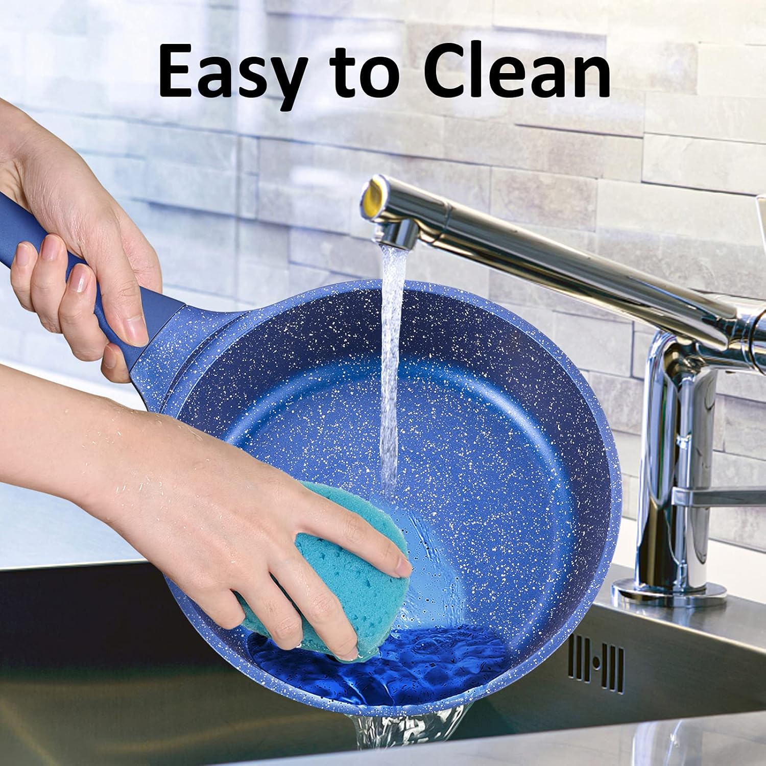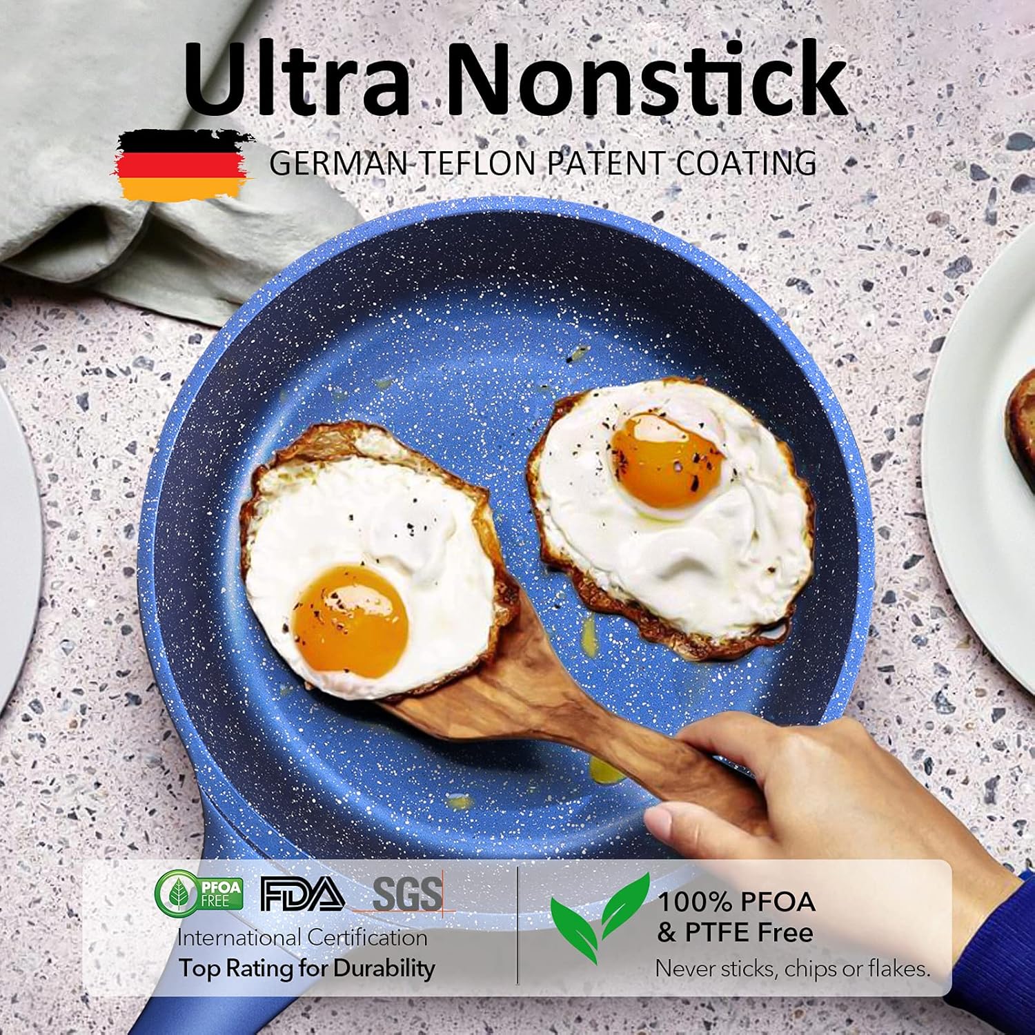 - [UNIQUE DESIGN, QUALITY HANDLE& LID] The German special-designed stylish gradient USA BLUE color makes a bold style statement. Silicon-sealed Lid & Knob seal in heat and moisture more efficiently, helping retain the flavor & nutrition of the food. With the clear lid, you can monitor your food while you steam it to prevent burning or overcooking. No need to worry about grease splashing out of the nonstick frying pan while cooking.