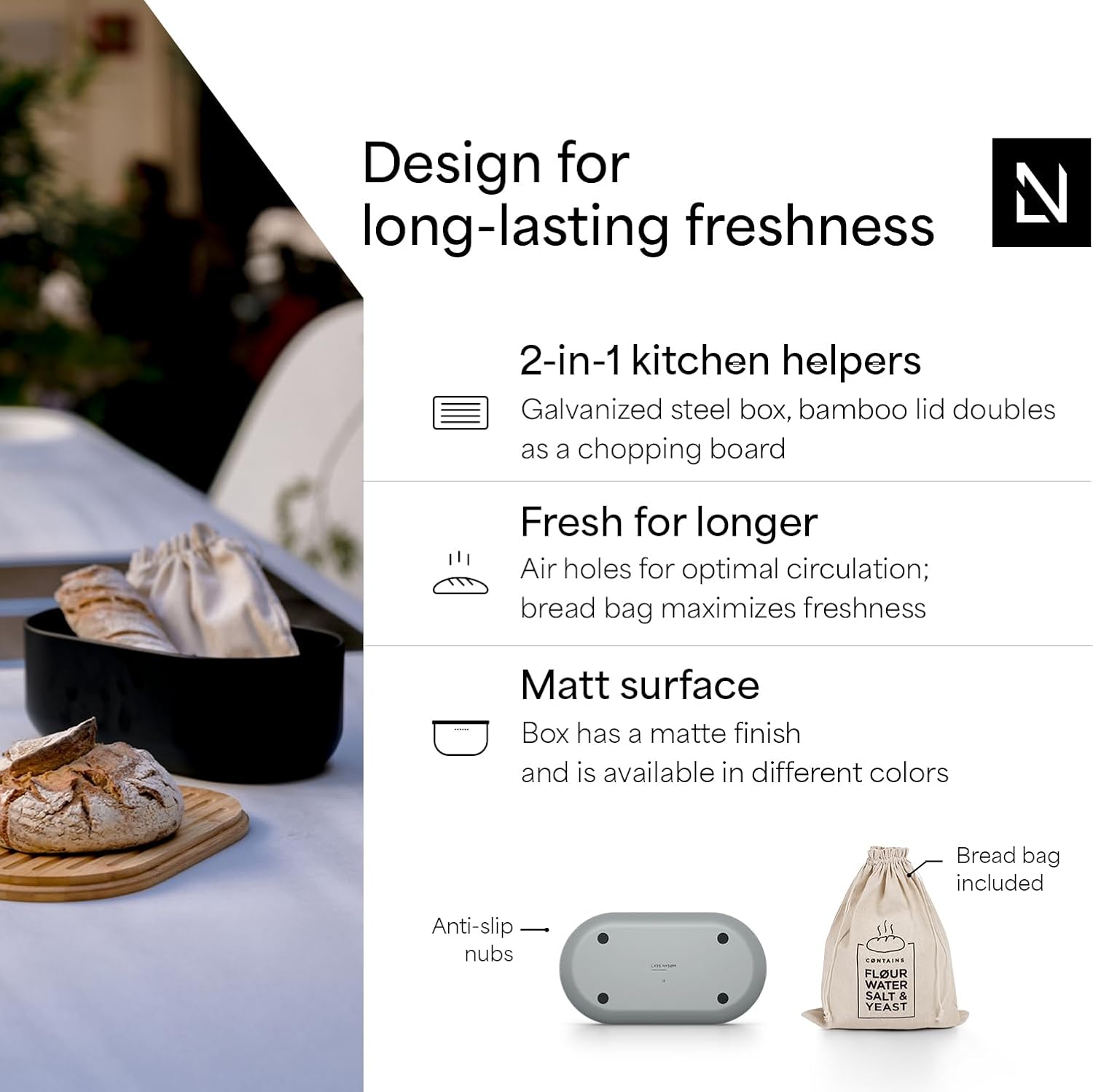 - MINIMALIST DESIGN: Our Bread Bin "Ægte" by LARS NYSØM is a minimalist piece for your kitchen and a real all-rounder that keeps your favorite pastries fresh for a long time. Perfect for storing bread, onion and potatoes. 14.2 x 7.5 x 5.1 In.