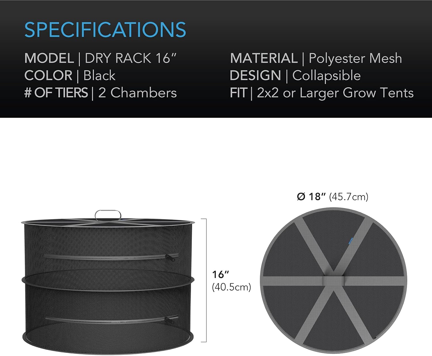- 2 Tiers | 18 in. Diameter | Fits 2x2 or Larger Grow Tents | Includes Hanging Hook & Carrying Bag