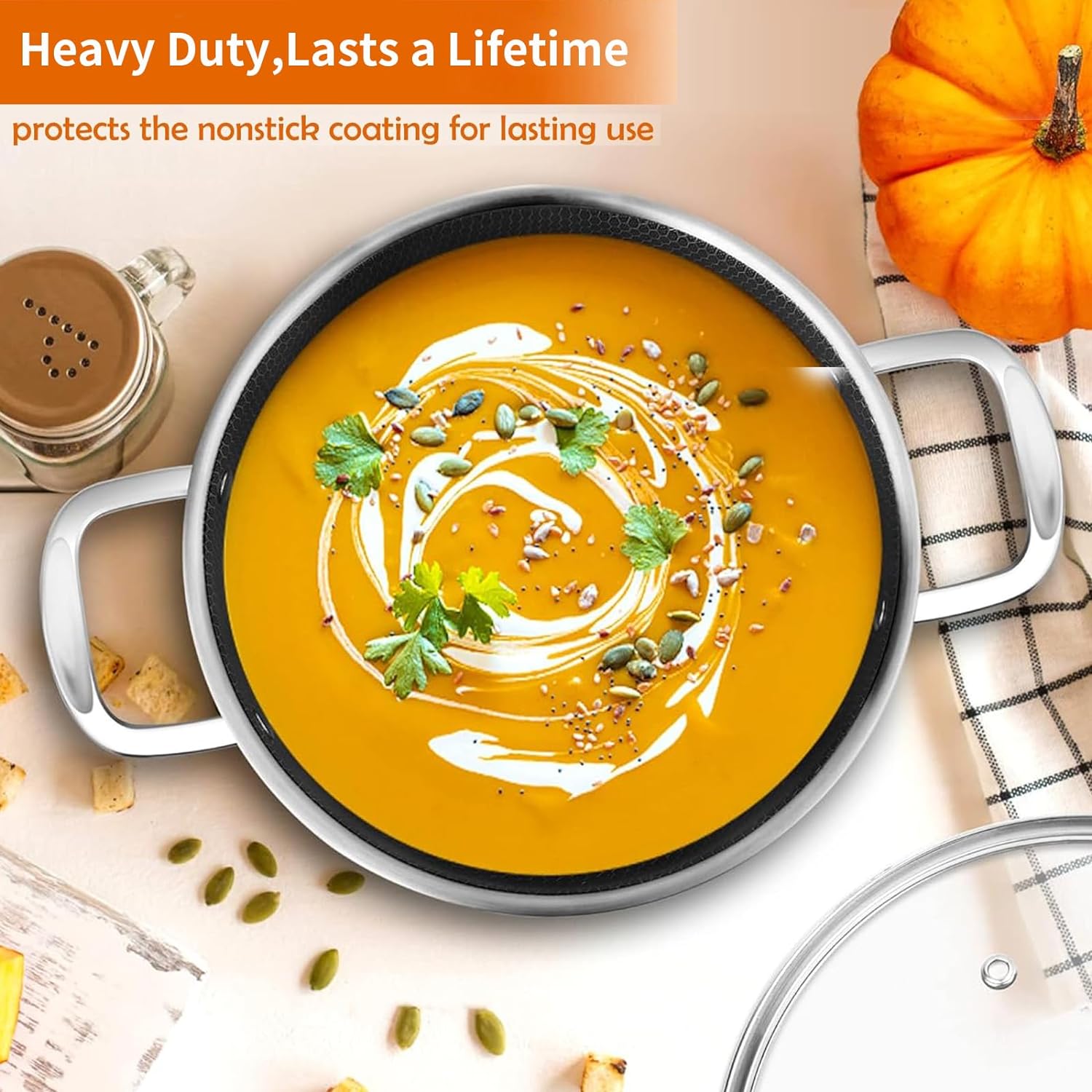 - Professional Design Meeting Chef Standards for The Soup pot. Comfortable Handles and Glass Lid. The Non Stick 5QT Pots is Equipped with a Glass Lid Rimmed with Stainless Steel, Featuring a Steam Vent for Safety, and Sturdy Handles Connected with Stainless Steel Rivets, wide & deep for a secure grip.