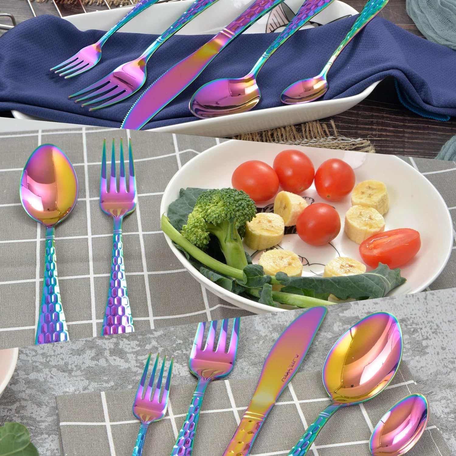 - 🌟🍴【ELEGANT MODERN DESIGN FLATWARE SET】The hammered silverware set every single cutlery is finely polished for multiple time to be finally achieve the perfect mirror finish result, coated with the eye-catching color coat, brings out this awesome appearance. This colourful spoons and forks set stainless steel promises to become your dinner plate’s best companion!Simple and modern flatware set would match well with your existing cutlery sets and provide you a fine dining experience.
