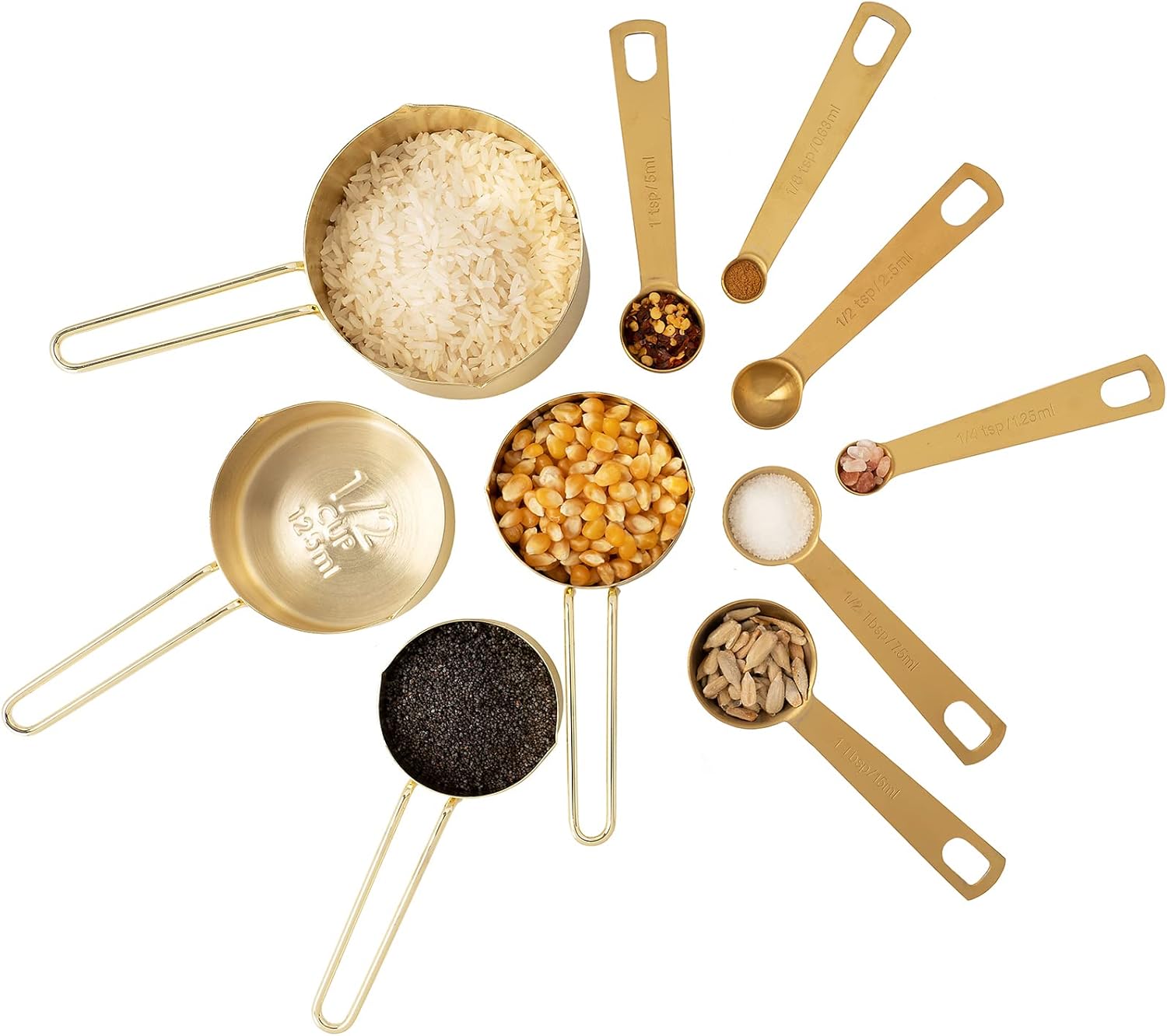 - Contains 4 gold measuring cups (1 cup, ½ cup, 1/3 cup and ¼ cup) and 6 spoons (1 tbsp, ½ tbsp, 1 tsp, ½ tsp, ¼ tsp and 1/8 tsp) for all your baking and cooking needs.
