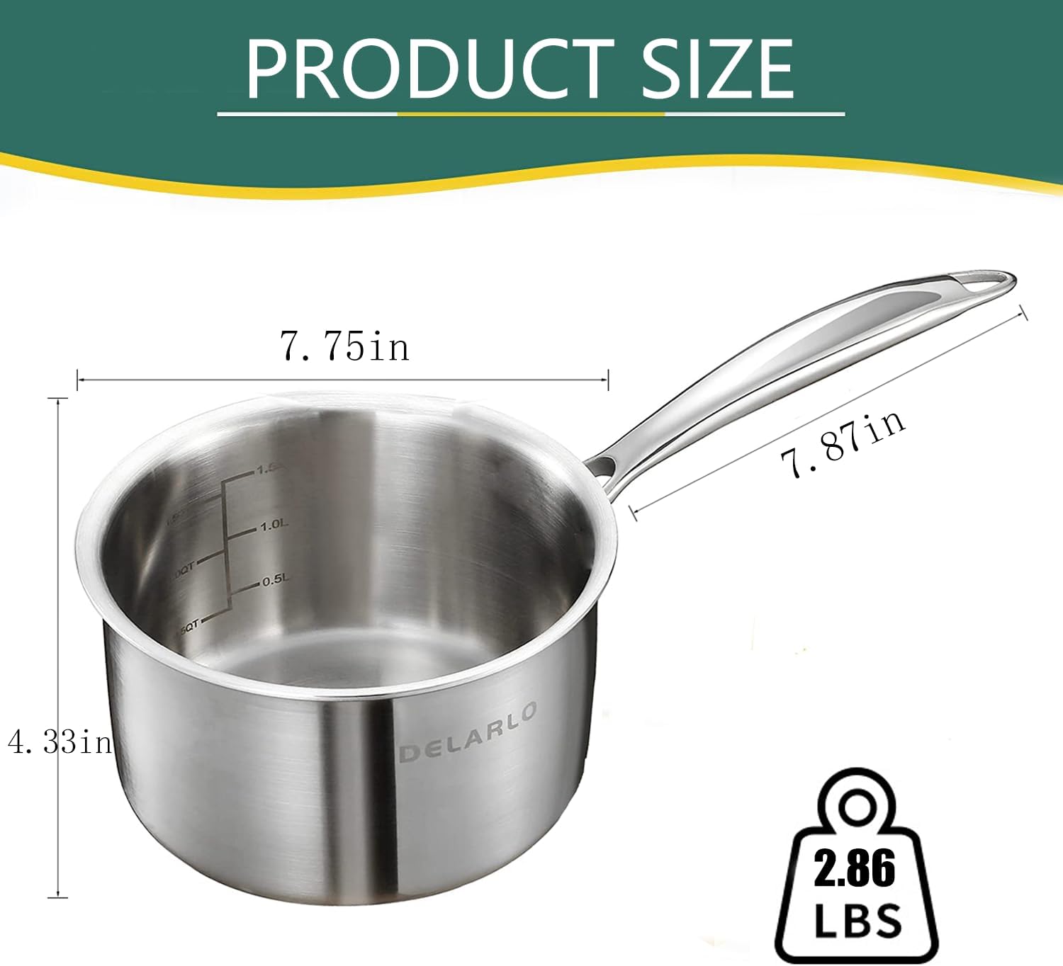 - Delarlo Whole Clad Tri-Ply Stainless Steel Sauce Pan Metal Construction Combines Food Grade Stainless Steel with an Aluminium Core and Outer 18/0 Stainless Steel, Creating a Permanent Bond That Enables Heat to Pass Through the Entire 2.5QT Cooking Pot- Along the Bottom and Up the Sidewall, Ensuring Fast and Even Heat Distribution for Maximum Cooking Performance. Triply Stainless Steel can help Save Fuel by up to 20%, Value for Money