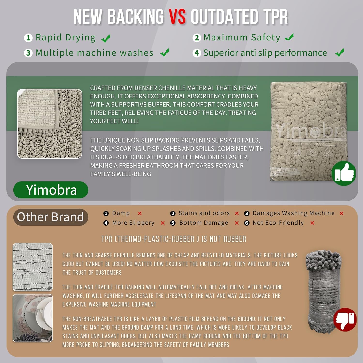 - Total Grip Safety & Quick Dry: Yimobra bath rug features a feather-light yet ultra-grippy hot-melt backing that stays firmly in place on wet surfaces. Its vertical air-channel chenille fibers ensure rapid and complete dryness, providing instant dry safety the moment you step out of the shower. The product is tested for harmful substances, performance, longevity, and emissions in accordance with the OEKO-TEX Standard 100
