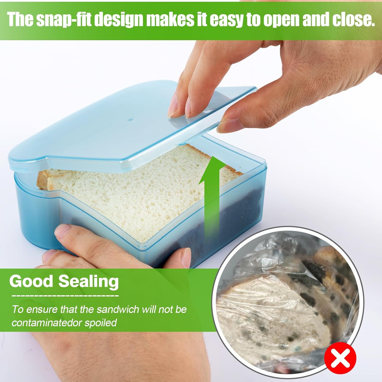 - Convenient Design: The sandwich containers for lunch boxes have a simple snap-on lid for easy opening and closing. Our sandwich box can also be heated in the microwave, so you can quickly eat a hot lunch.