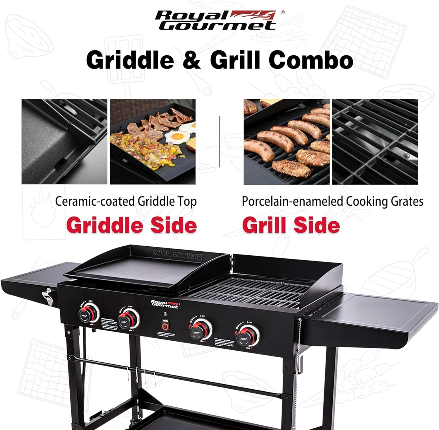 Royal Gourmet GD402 4-Burner Propane Gas Grill and Griddle Combo with Foldable Legs, 48,000 BTUs, Portable Griddle Grill Combo for Outdoor Cooking While Camping or Tailgating, Black