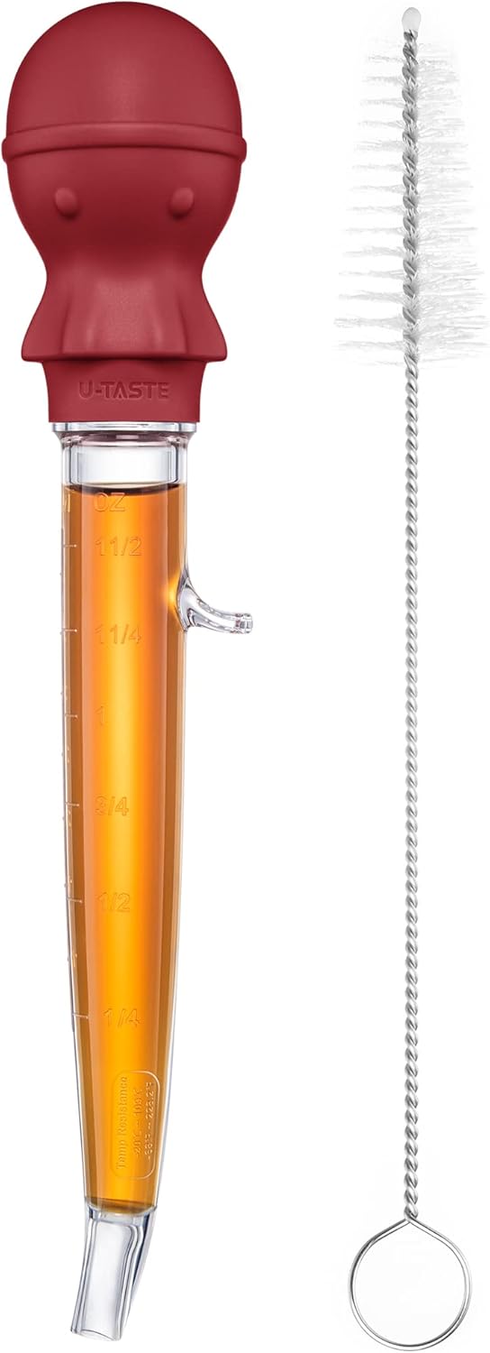 U-Taste 1.5oz Angled Turkey Baster - 228.2ºF Heat Resistant Food Grade Tritan and Silicone Large Octopus Bulb Baster Set with Cleaning Brush for Cooking Basting Meat Poultry Beef Chicken (Red)