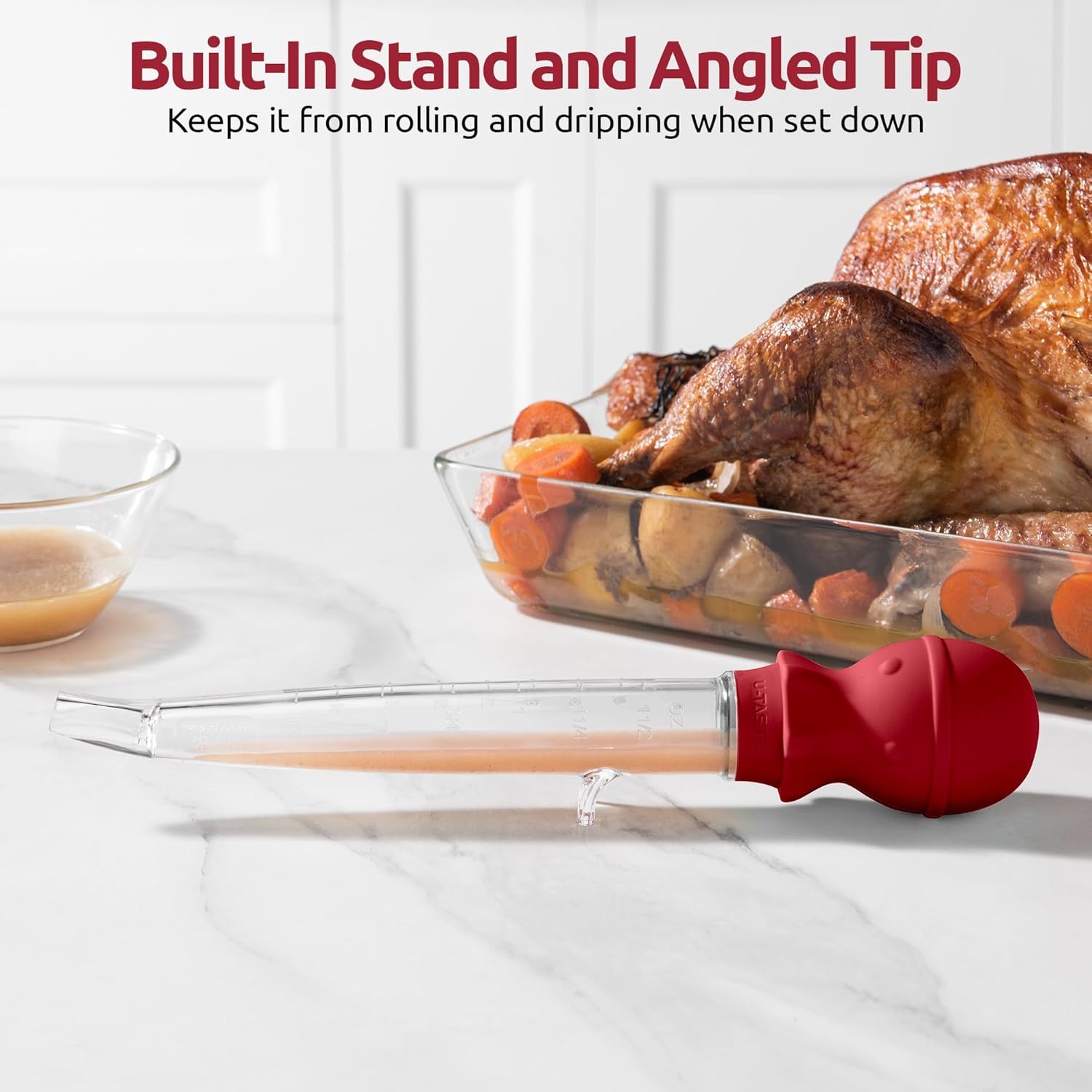 - [Slanted Tip and Integrated Construction] A turkey baster for cooking with a slanted tip can do you a lot of favors. Though the tube is hard and thick, a curve tip helps to cover the most hard-to-reach places even under the turkey. When set down, the angled neck keeps the tip up from the counter, which keeps leakage. It takes efforts to make tube and tip in a whole, but we did it. Cracks, leaking, hard-to-clean joint place? Integrated construction fixes these problems once for all.