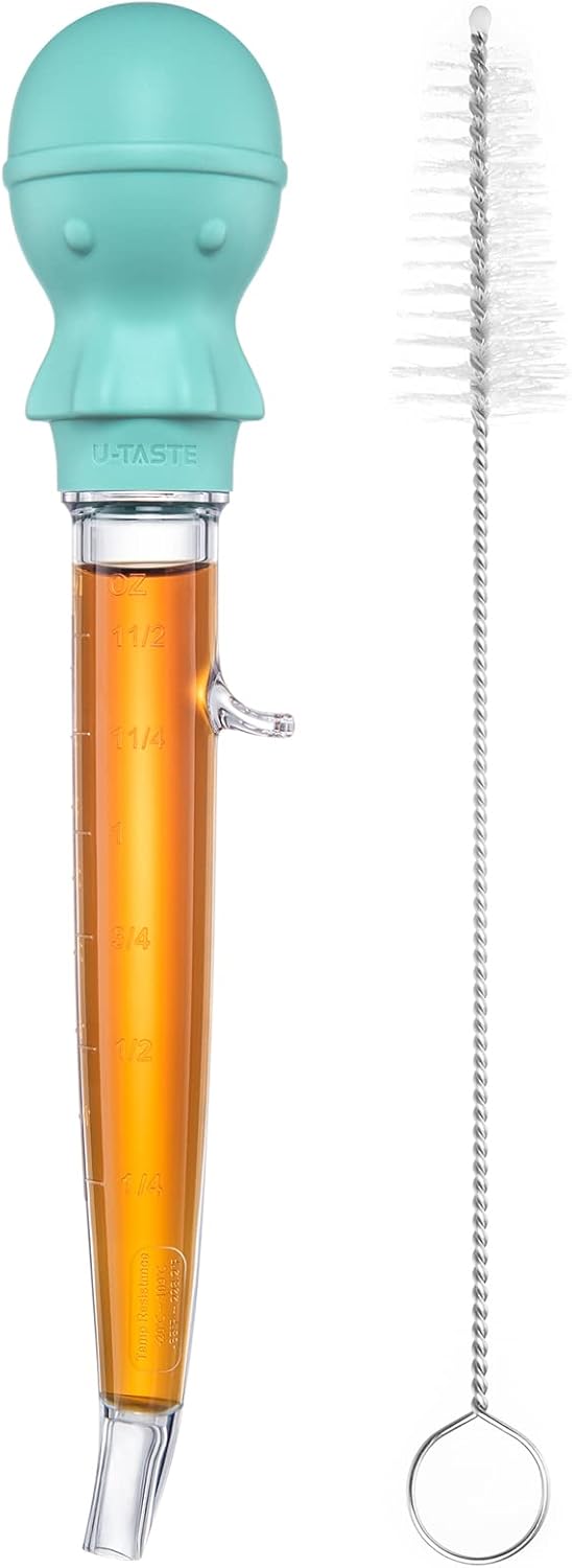 - [Heat Resistant Silicone and Tritan] U-Taste turkey baster is built to withstand hot juice. No melting issues. The cute octopus bulb is made of 600℉ heat resistant silicone and Food Grade food grade tritan body (Tritan is a temperature-resistant PCTG with a temperature resistance of -4~228.2℉). The clear-like-crystal texture lets you know what you are basting the food with. You can use it to baste turkey or ham, or to extract fat from baking meatloaf.