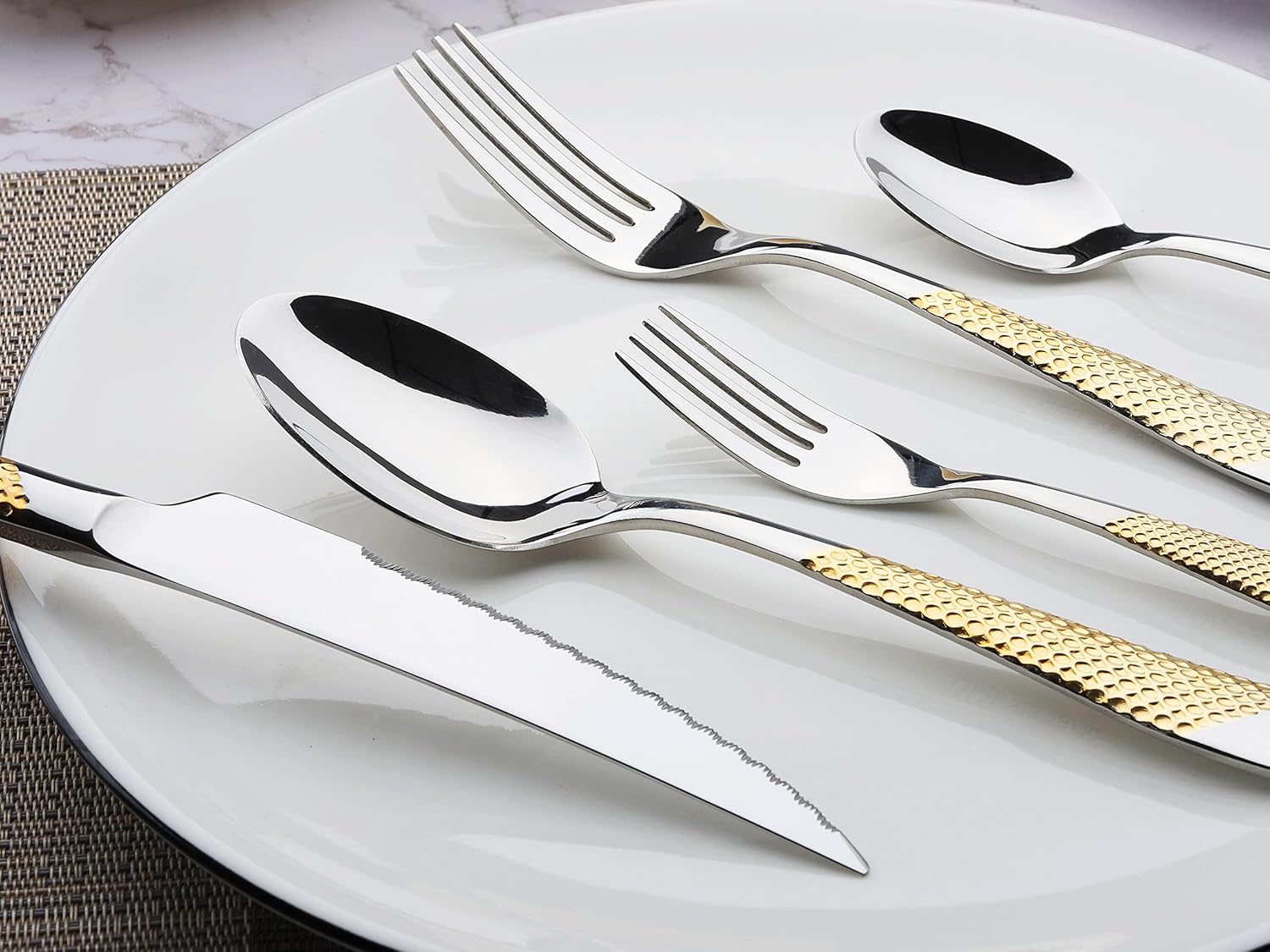 - 【Simple Desgin】The embossed pattern on the handle is a major feature of this cutlery set.The gold-plated process is adopted. The concave-convex pattern makes you not slippery in use. The design of the whole set of flatware looks simple and fashionable.
