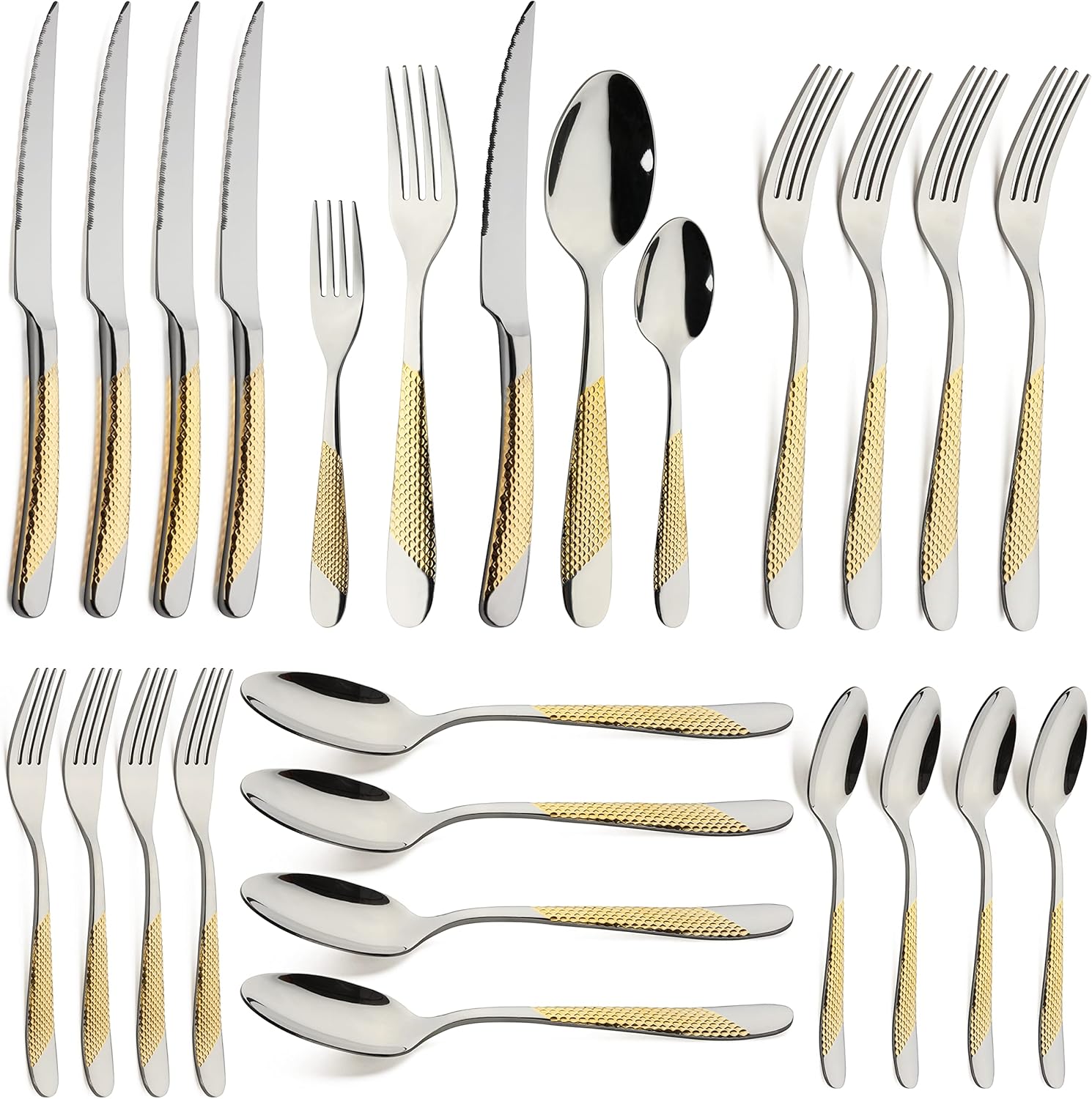 - 【Gold Silverware Set】This 20-piece flatware set includes 4 salad forks, 4 dinner forks, 4 dinner knives, 4 dinner spoons, 4 teaspoons.It can be used for daily use,service for 4 people.