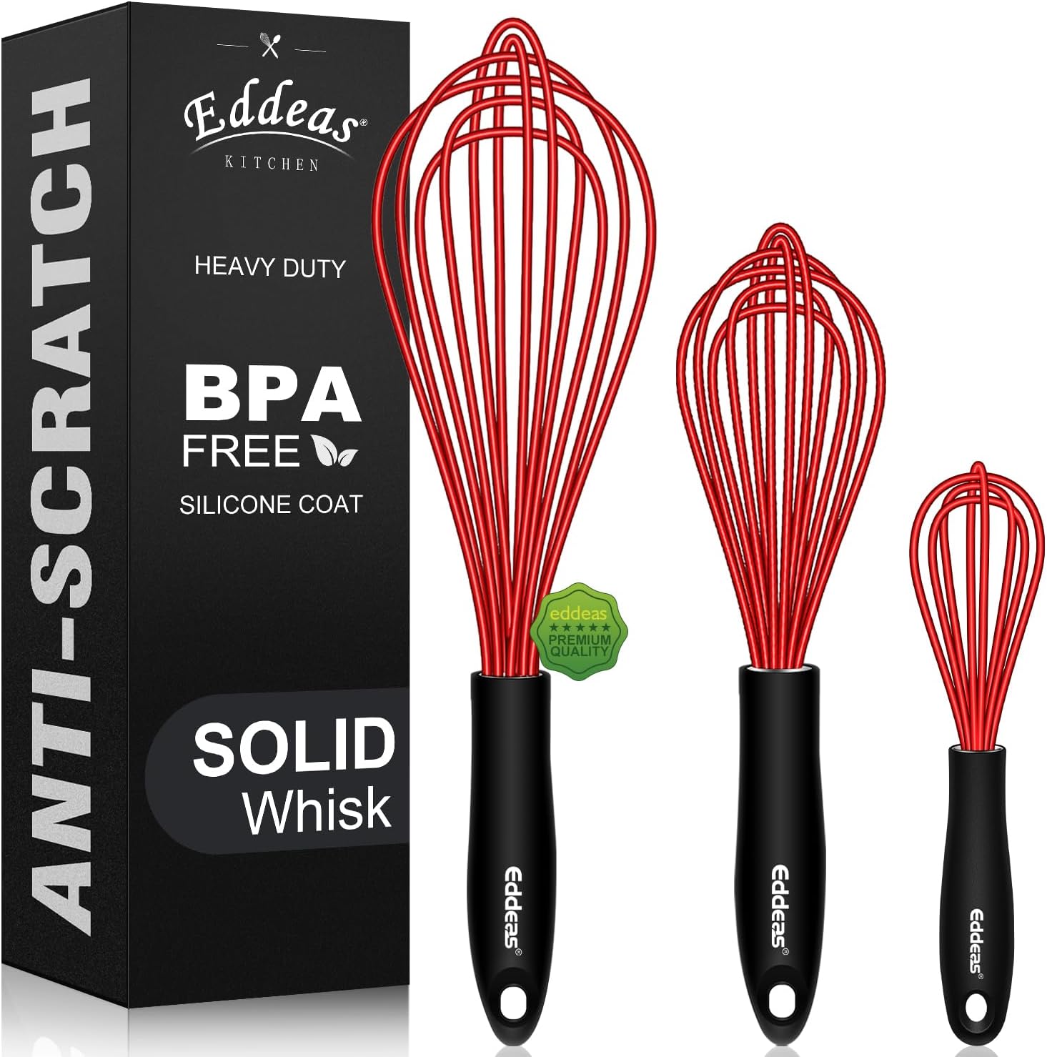 Silicone Whisk, Eddeas Stainless Steel & Silicone Non-Stick Coated Whisks set of 3-Heat Resistant (450°F) Kitchen Whisks Perfect for Blending, Whisking, Beating & Stirring, Red