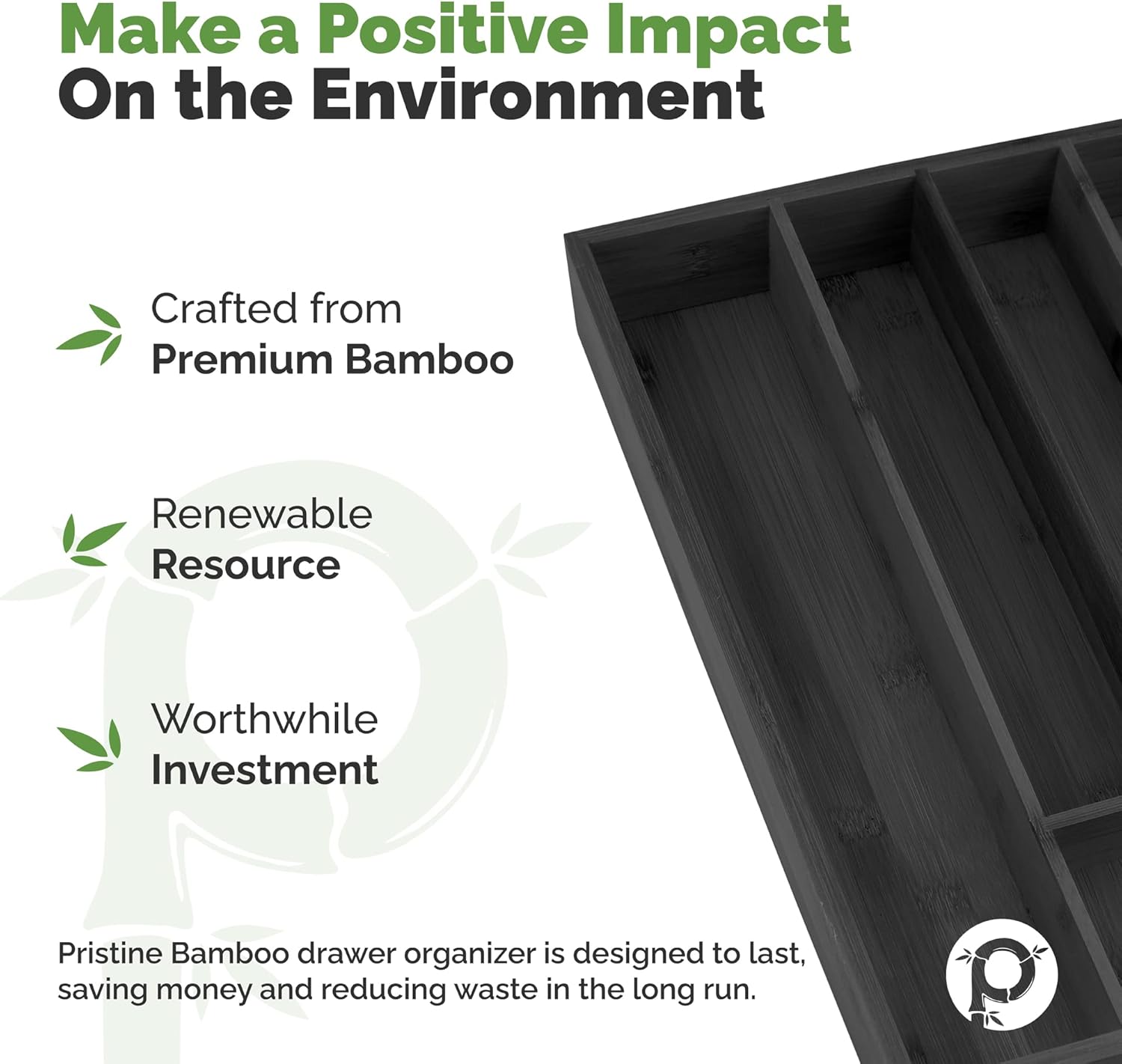 - MULTIPURPOSE USE: You can use the Pristine Bamboo silverware drawer organizer tray for many things! It would be perfect in your bedroom or bathroom. You might want to put all of those extra items that are just taking up space into an organized system instead—like Flatware, Utensils, Jewelry, Silverware, and makeup...the possibilities seem endless when you think about how much easier everything will become with Pristine Bamboo :)