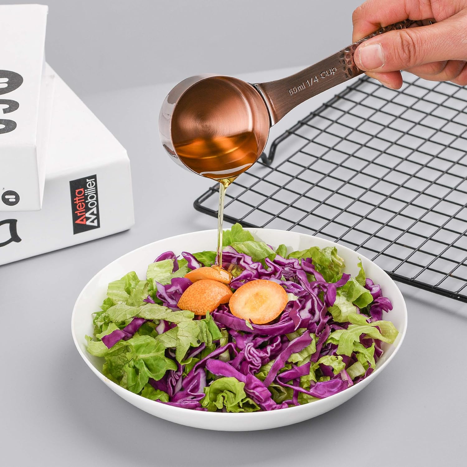 - Measuring cups set: 1/8cup 30ml,1/4cup 60ml,1/3cup 80ml,1/2cup 120ml,1 cup 240ml; Measuring Spoons Set:1/8 tsp 0.63ml, 1/4 tsp 1.25ml, 1/2 tsp 2.5ml, 1 tsp 5ml,1/2 tbsp 7.5ml, 1 tbsp 15ml.<br>Measure Ingredient Leveler and Rings.