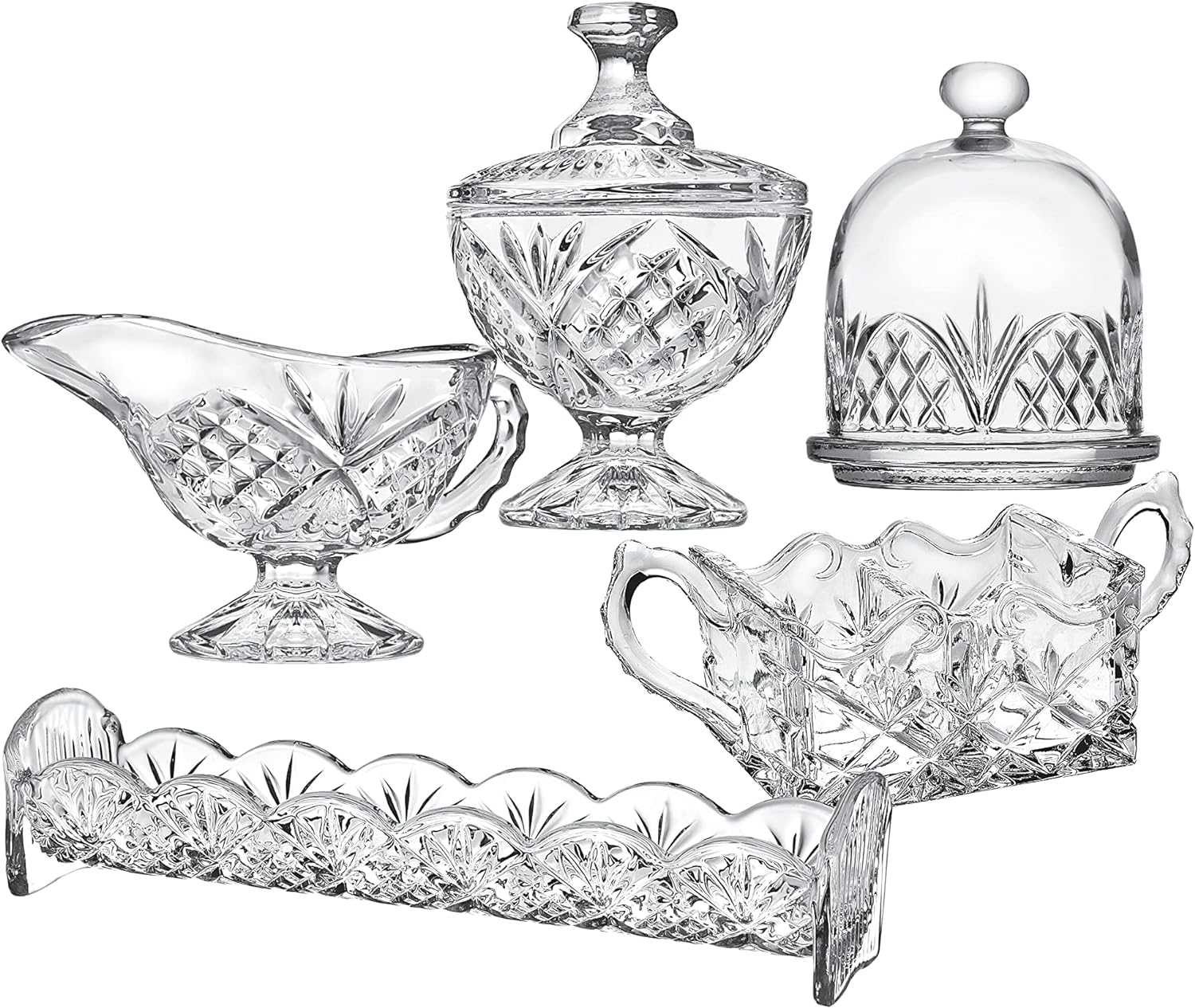Godinger Serving Hostess Set - Butter Dish, Sugar and Creamer, Packet Holder, Cracker Tray - 5 Piece Set, Dublin Collection