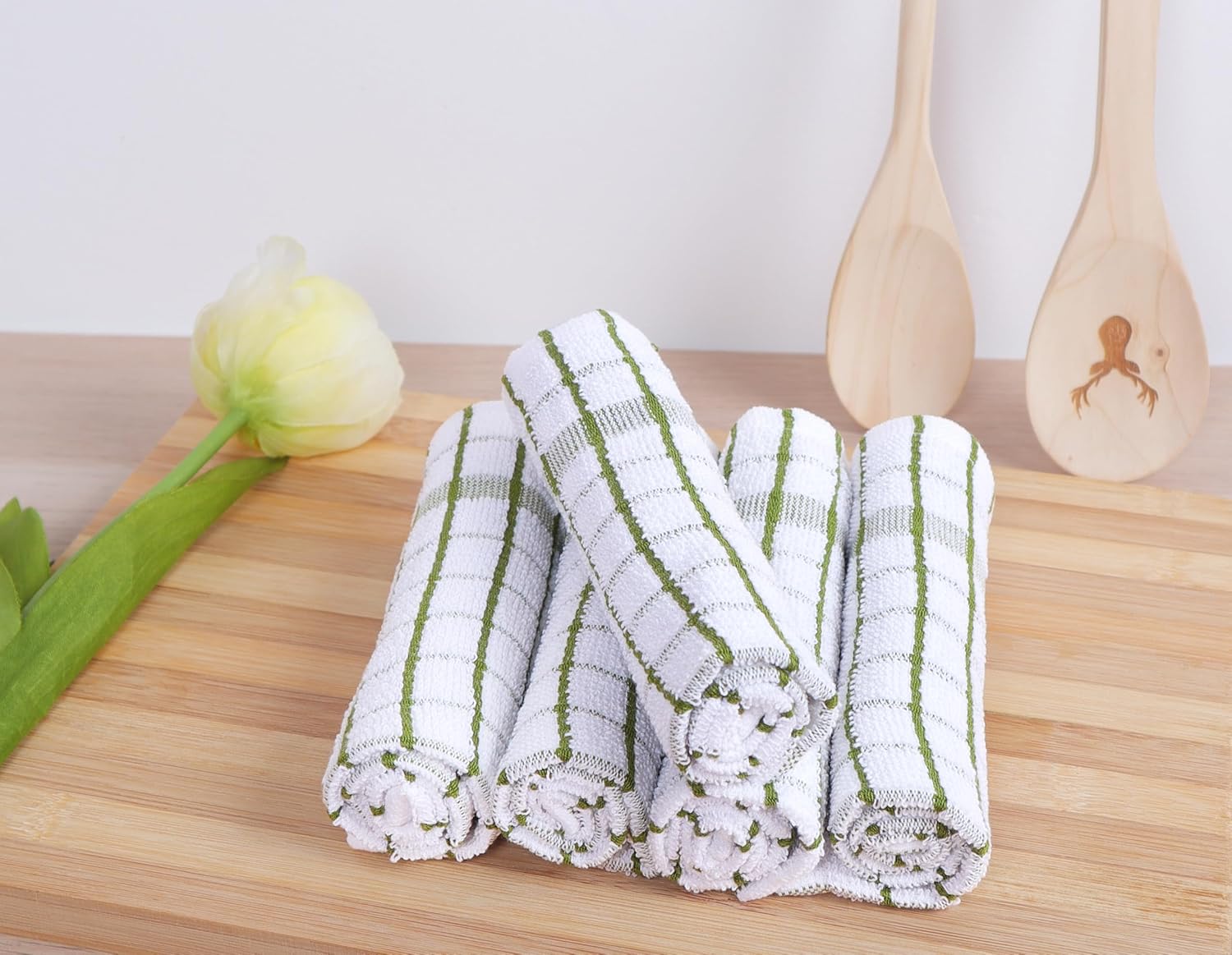 - SET OF 8 DISHCLOTHS: This set includes 8 premium-quality, 12" x 12" dish cloths, crafted from , high-density terry cotton. Ideal for everyday kitchen use, each cloth provides an excellent balance of softness and absorbency, ensuring a luxurious feel and optimal cleaning performance.