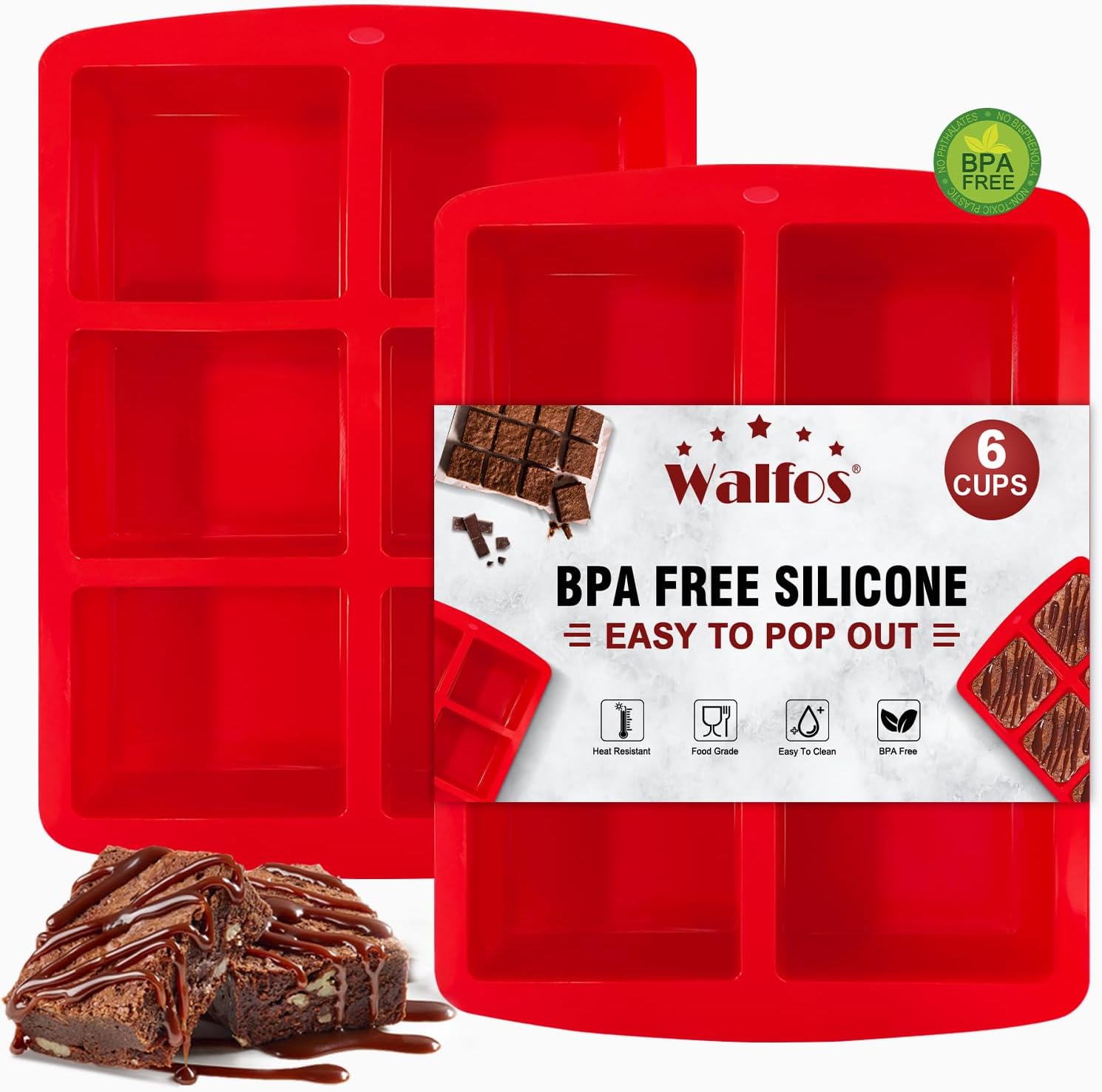 Walfos Mini Silicone Brownie Pan - 2 Piece 6-Cavity Non-stick Square Baking Pan, Perfect for Mini Brownies, Cornbread, Muffin and Cakes, BPA Free and Dishwasher Safe