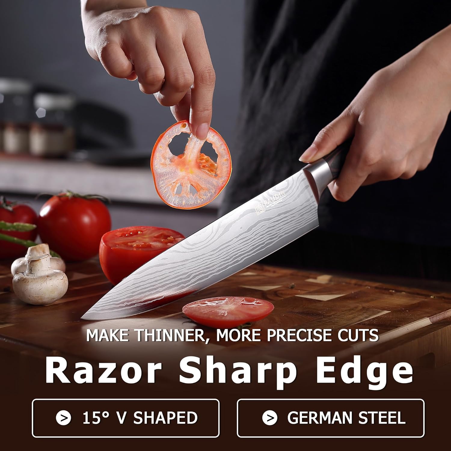 - Easy Care and Storage: All knives are organized into beautiful sturdy wooden knife block that effectively protect the kitchen knife and reduce the risk of rust. Easy to take out and save space. Hand washing knives keeps them sharp and shiny better. The knife set with block is equipped with a sharpening rod, which is convenient for you to maintain the sharpness of all your knives