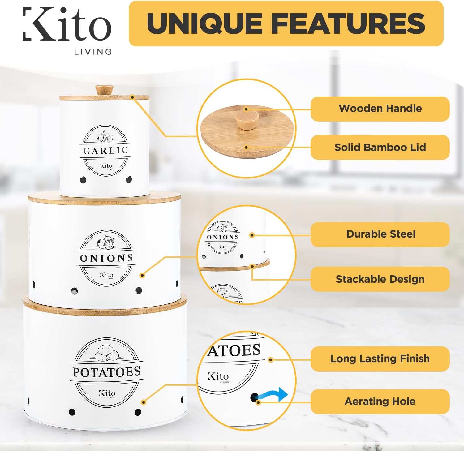 - DURABLE AND STURDY BUILD: The garlic, onion, and potato storage bins are made using lightweight yet durable steel with a protective coating to handle everyday use and come with wooden bamboo lids to keep anything inside safe. The wooden handles allow you to move them around with ease