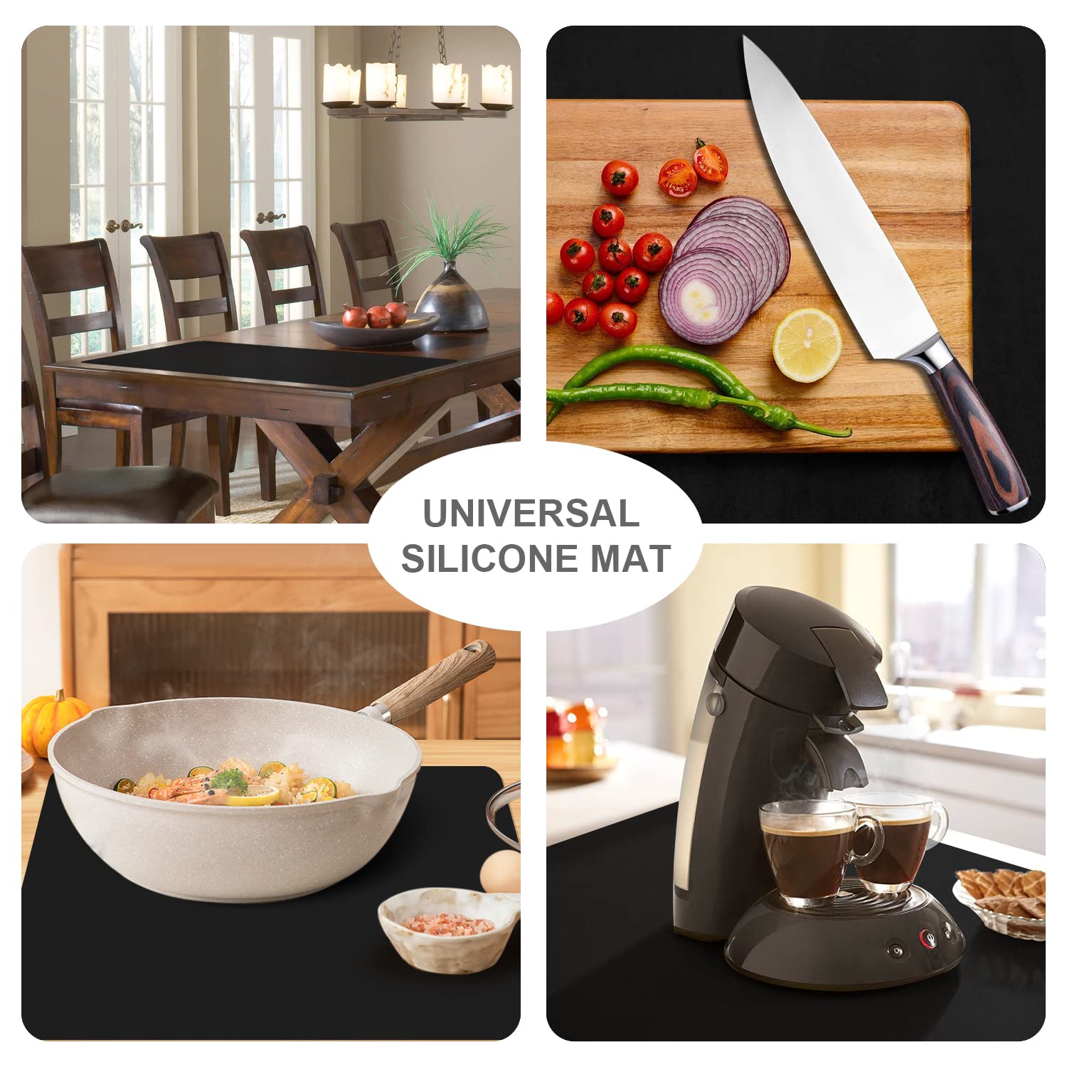 - ✅ HEAT RESISTANT COUNTERTOP PROTECTOR: Insulated countertop mats heat resistant temperature is -104℉ to 446℉(-40℃ - 230℃);black silicone mat for kitchen counter helps protect our wooden dining table and granite countertop from heat damage, scratches, abrasion, grease, and more, extend the life of precious furniture.
