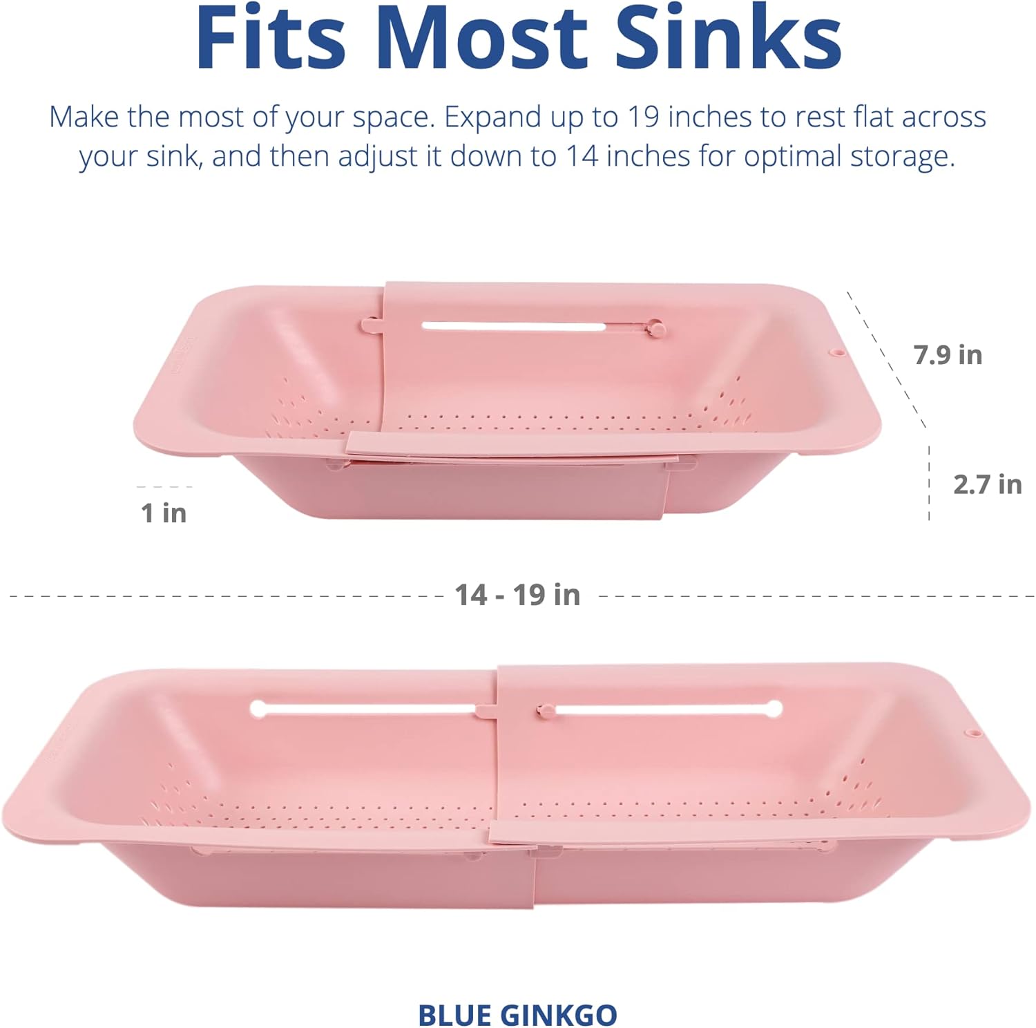 BLUE GINKGO Sink Colander Baskets - (Pack of 2) Wash Vegetables and Fruits, Drain Cooked Pasta and Dry Dishes - Extendable - New Home Kitchen Essentials (2 Pink)