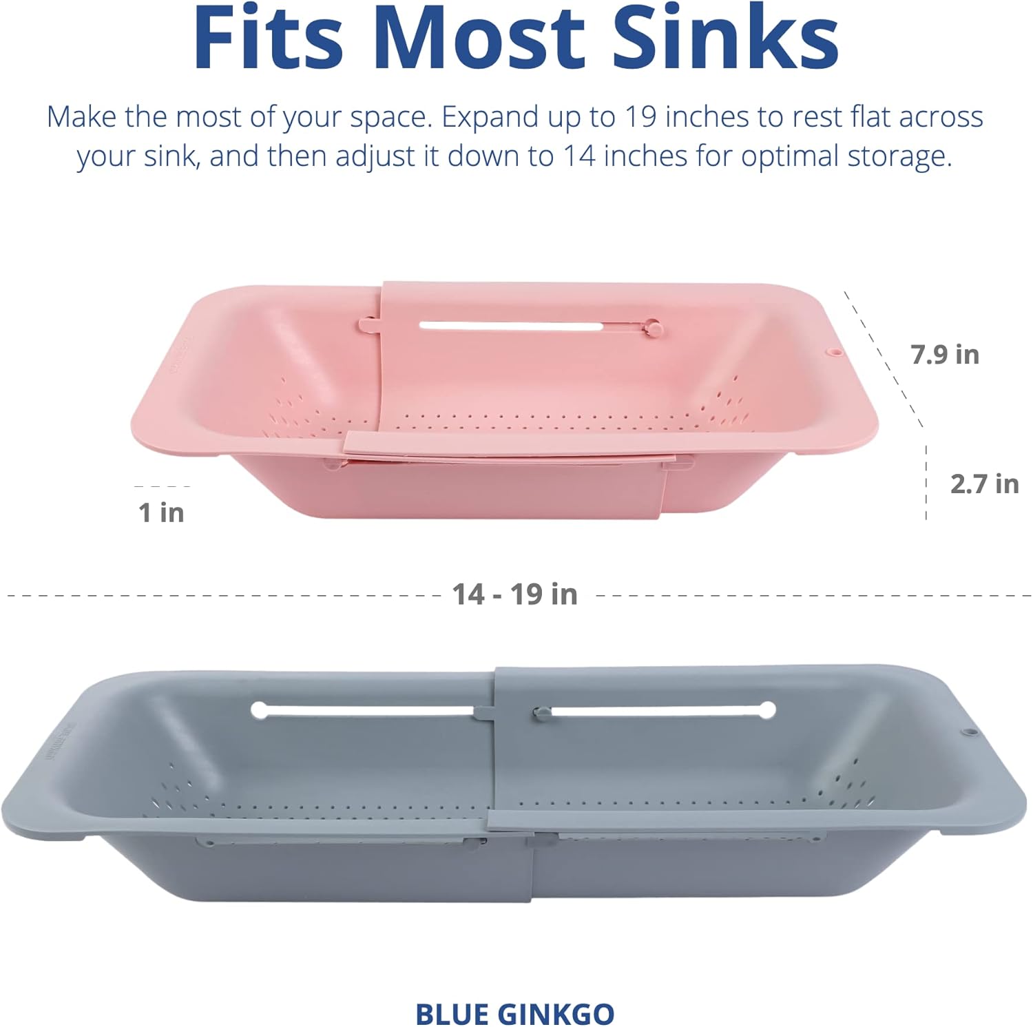 BLUE GINKGO Sink Colander Baskets - (Pack of 2) Wash Vegetables and Fruits, Drain Cooked Pasta and Dry Dishes - Extendable - New Home Kitchen Essentials (Grey & Pink)