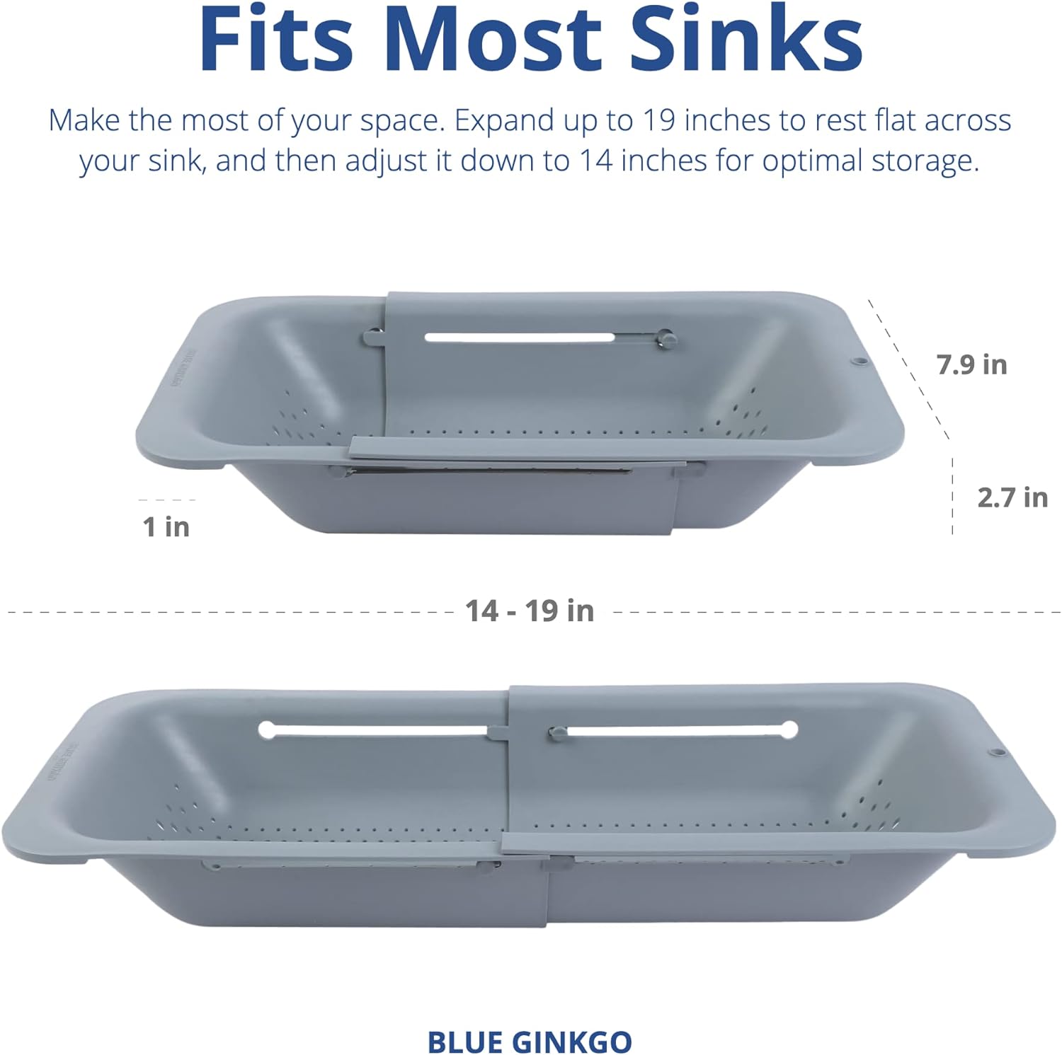 BLUE GINKGO Sink Colander Baskets - (Pack of 2) Wash Vegetables and Fruits, Drain Cooked Pasta and Dry Dishes - Extendable - New Home Kitchen Essentials (2 Grey)