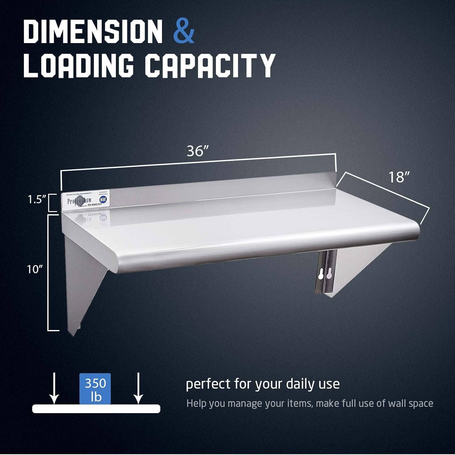 Profeeshaw NSF Stainless Steel Shelf 18” x 36”, 350 lb Commercial Shelves Wall Mounted Metal Shelving with Backsplash and 2 Brackets for Restaurant, Bar, Utility Room, Kitchen and Garage