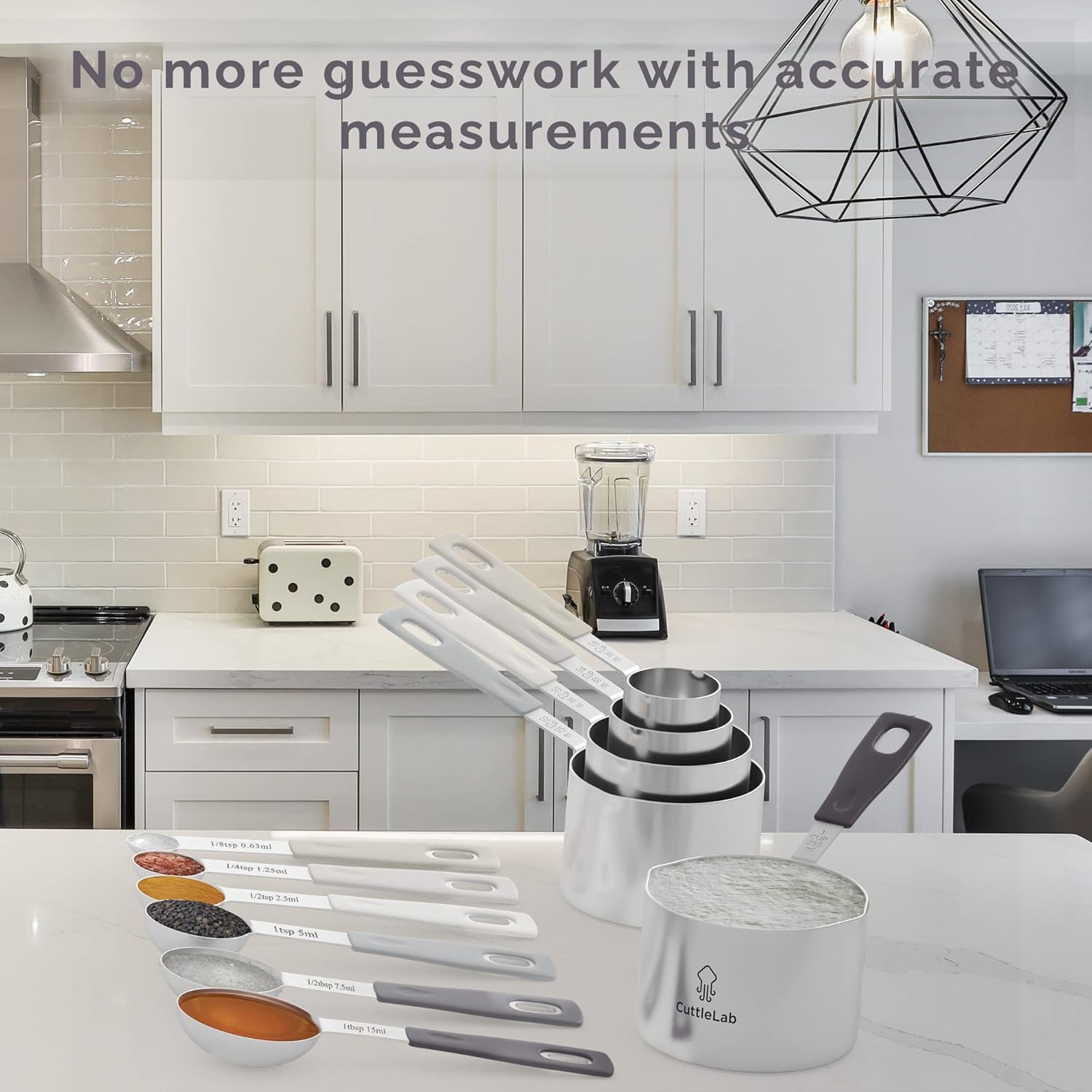 - This versitile set of 14 pieces include: * 5 measuring cup set (1/8, 1/4, 1/3, 1/2 and 1 cup ) * 2 tablespoon measure spoon (1 and 1/2 tbsp) 4 teaspoon measuring spoons (1, 1/2, 1/4 and 1/8) * 1 leveling tool with mini-ruler * 2 round hinged rings.