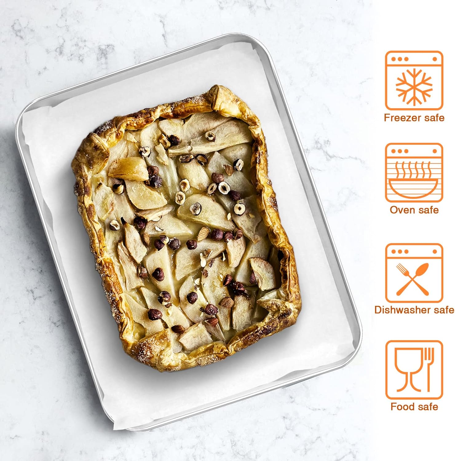 - 【HEALTHY & STURDY】Made of pure stainless steel without toxin, Ensure no harmful substances leaching on to food at high heat baking, Heavy-gauge steel stands up to the rigors of daily cooking, Better rust-proof and no easy warp, Superior to aluminum/nonstick coating pan, Durable enough to last a lifetime
