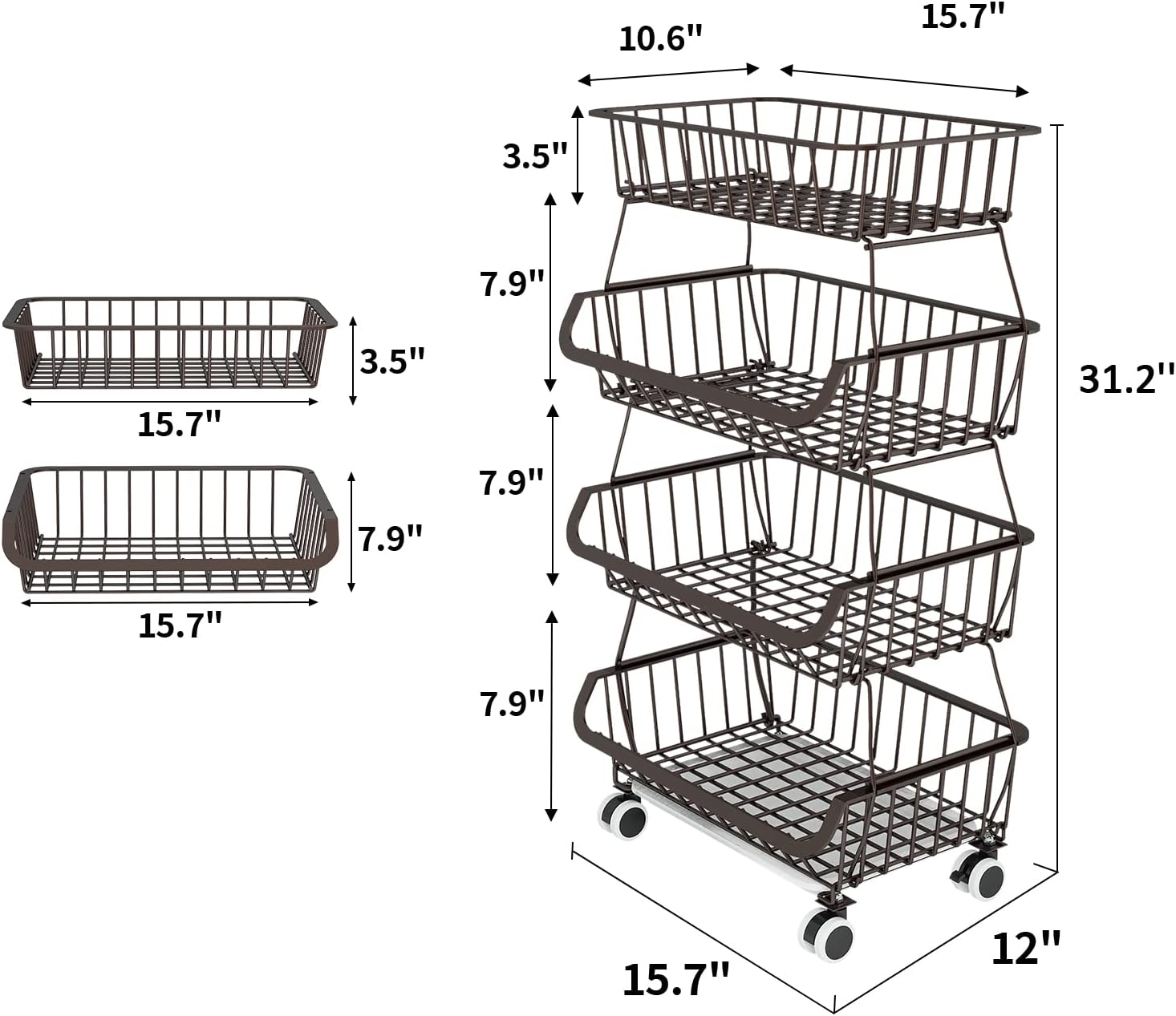 - 【4 Tier Stackable Storage Basket】Each layer of baskets can be stackable and detachable, which allow to combine the baskets freely in 1 to 4 tiers to match the height you need.Equipped with 4 non-slip foot pads and 4 floor universal wheels,you can use wheels to move on the floor or use foot pads to fix on the countertop.