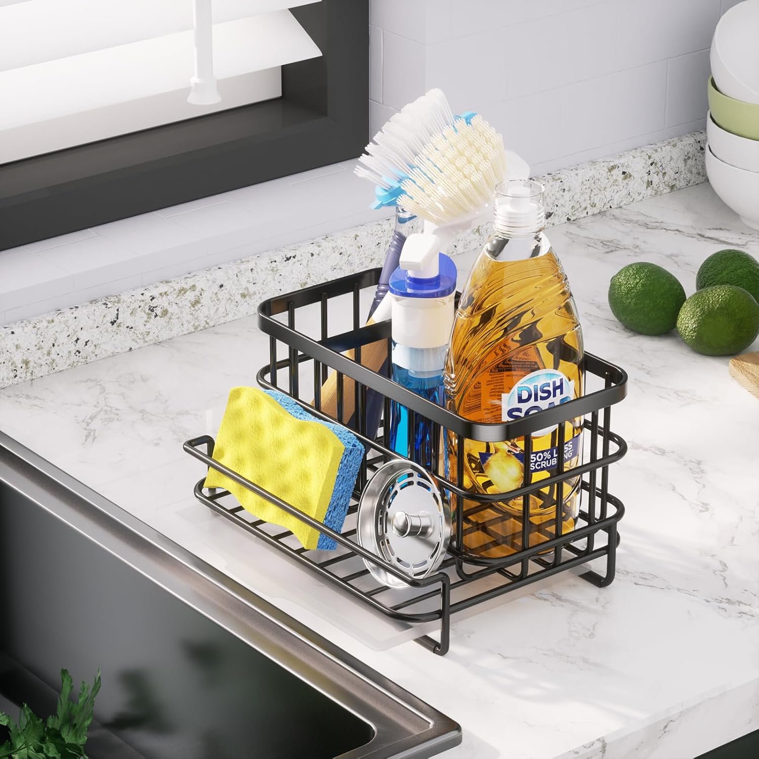 - [3 Partition Design]: You can store extra kitchen items in our kitchen sink caddy. This sink caddy's 3 compartments are ideal for holding sponges, dish soap bottles, sink stoppers, and other items