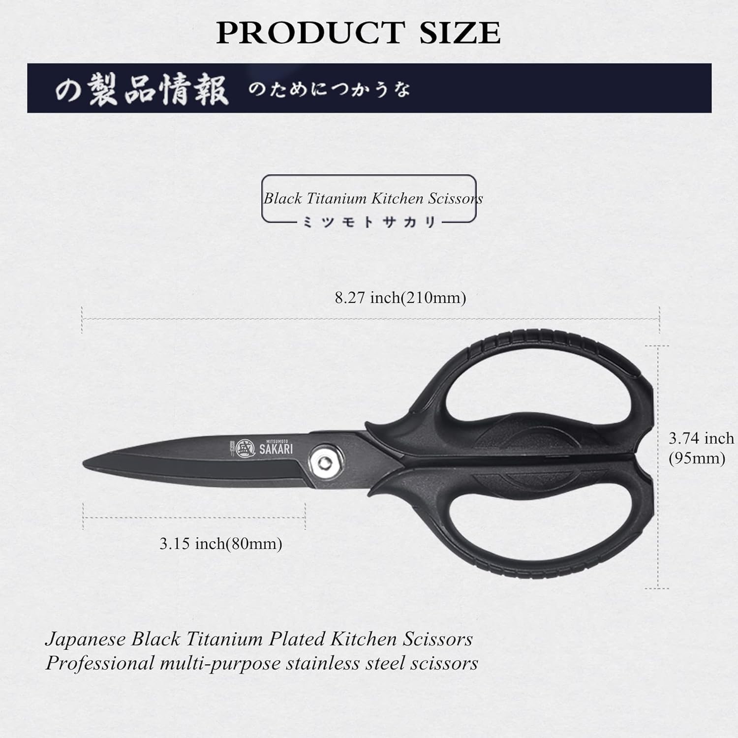 MITSUMOTO SAKARI Japanese Kitchen Scissors, All Purpose, Black Titanium Plated Heavy Duty, Multipurpose Cooking and Herb Scissors with Micro Serrated Edge