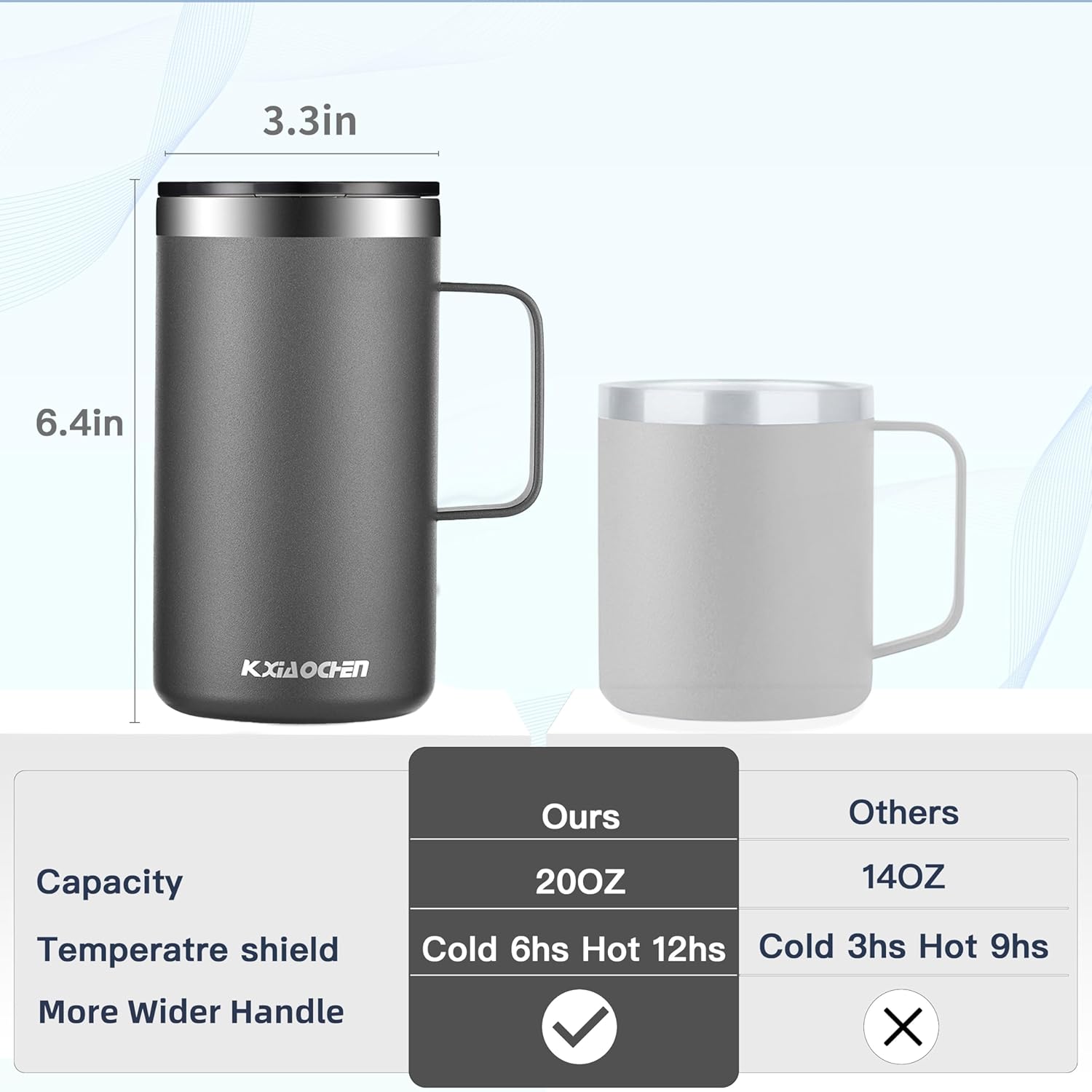 - INSULATED COFFEE MUG WITH HANDLE: 20oz coffee cup is large enough for heavy coffee lover at work, and also can be in beer gardens, home brews and the party. Insulated coffee mug with lid designed to keep your favorite hot, cold and carbonated beverages at the perfect temperature on the go.🌟【Friendly Note】The bottom of the mug is 3.3 inches in diameter, does not fit in car cup holder.