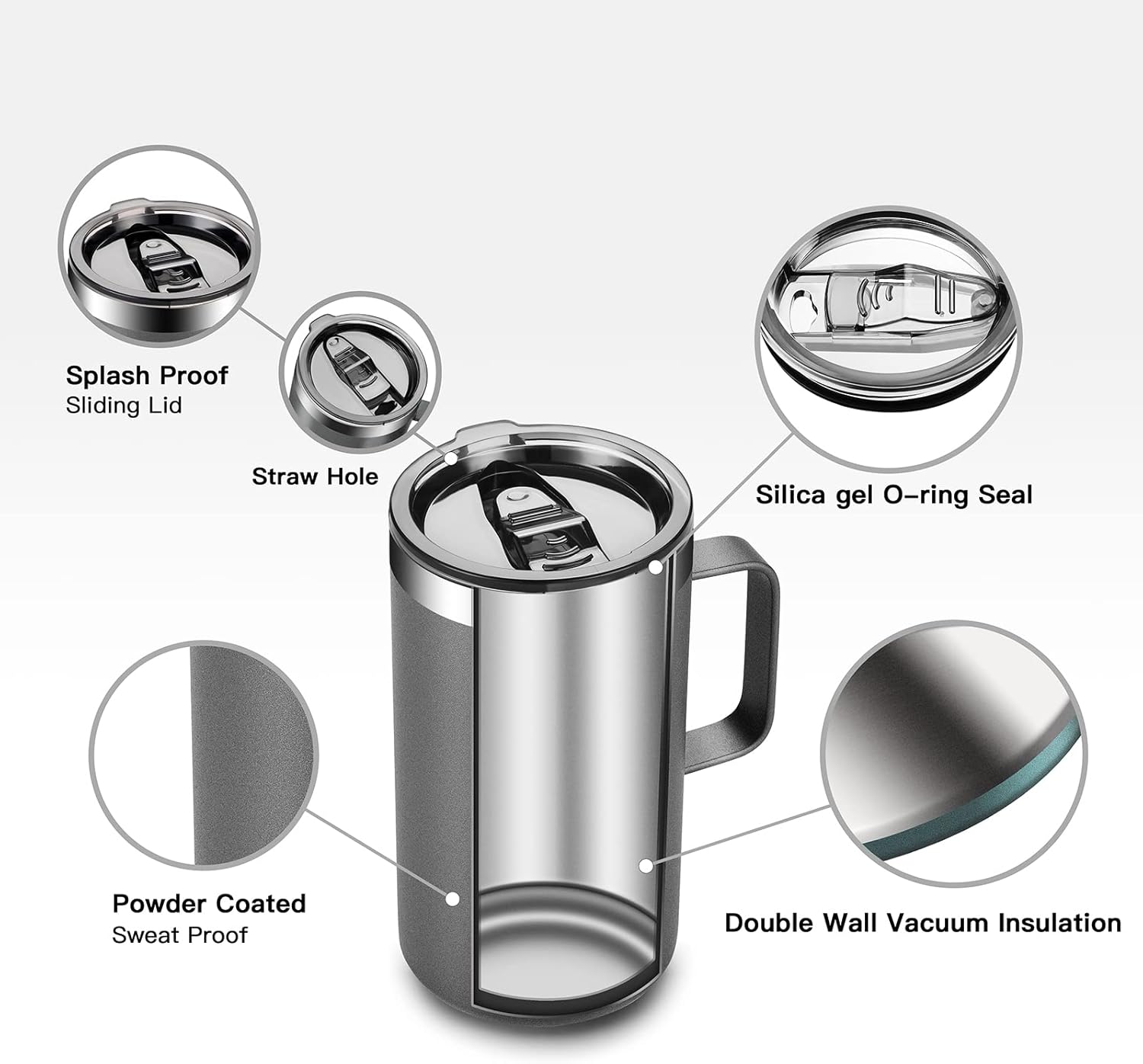 - PREMIUM SLIDING LID: The thermal mug has a new upgrade grey sliding lid, Drink hole on the top for easier sipping. BPA-free, Insulated coffee mug with lid and handle have a No Sweat Design to make sure your hands stay dry.