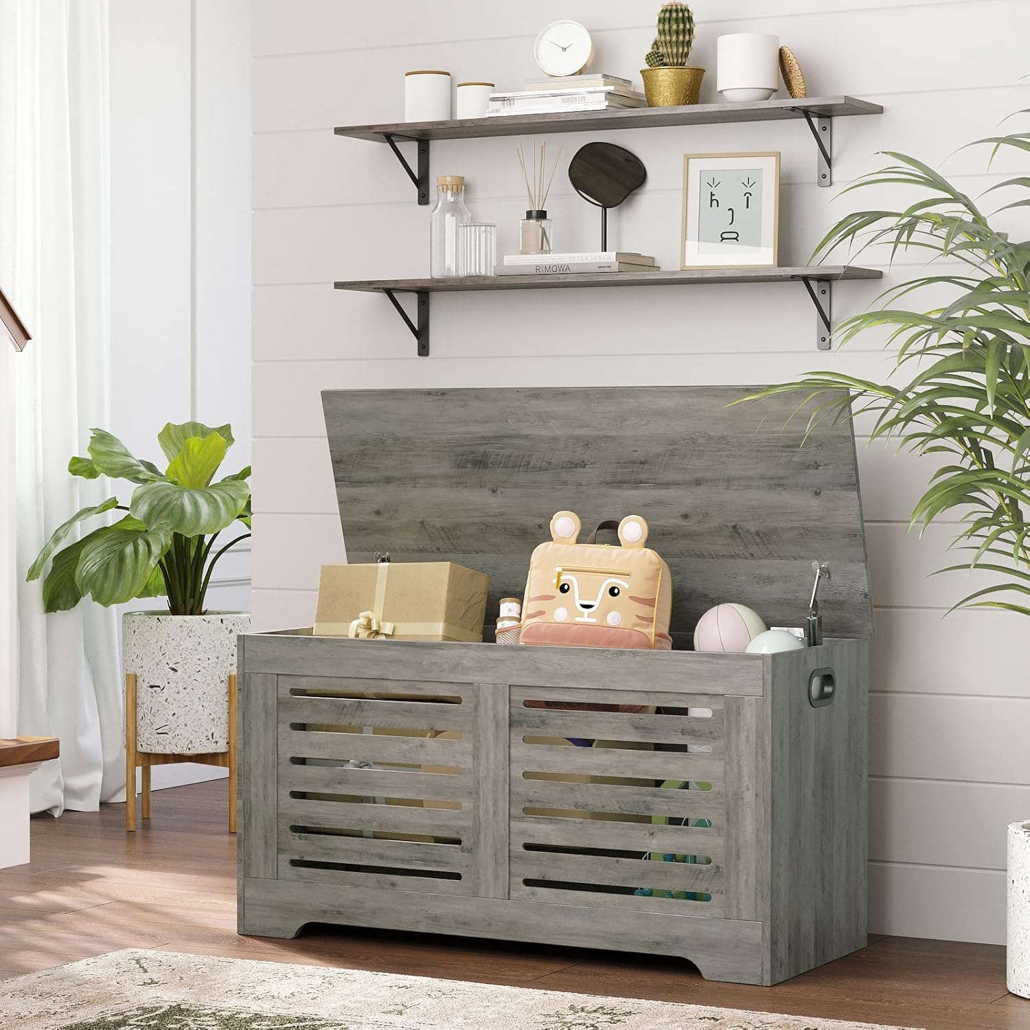 - 【Beautify Your Home】Elegant grey wash color complements tough lines, rusticity wood grain and industrial design add a classic and stylish vibe to your home. A perfect combination of wood and iron, bringing you a cozy life easily by placing some decorations. Matches with any wall perfectly