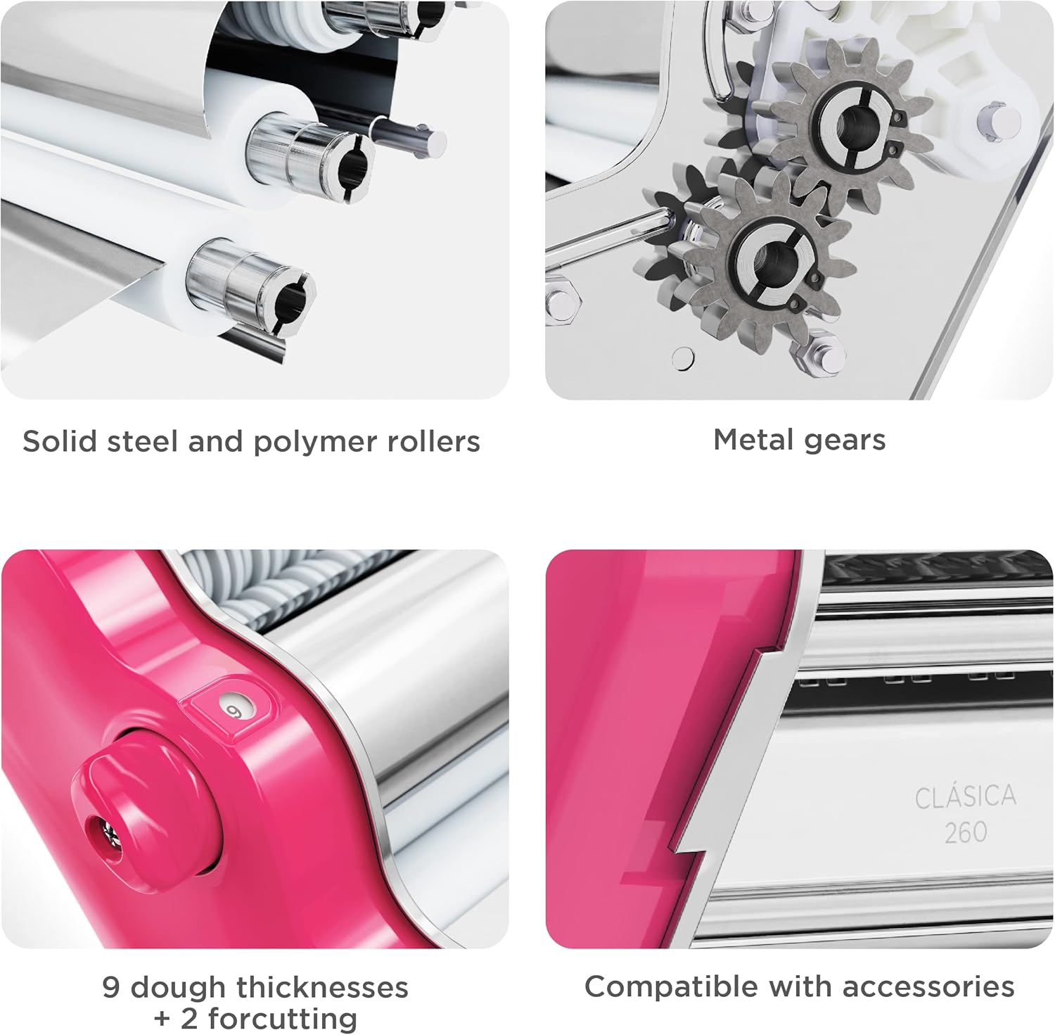 PASTALINDA Classic 260 Pasta Maker Machine, 26 cm Wide Rollers, 9 Thickness Positions, 2 Cutting Positions, Stainless Steel. Includes Reinforced Hand Crank And Two Clamps (Fuchsia)