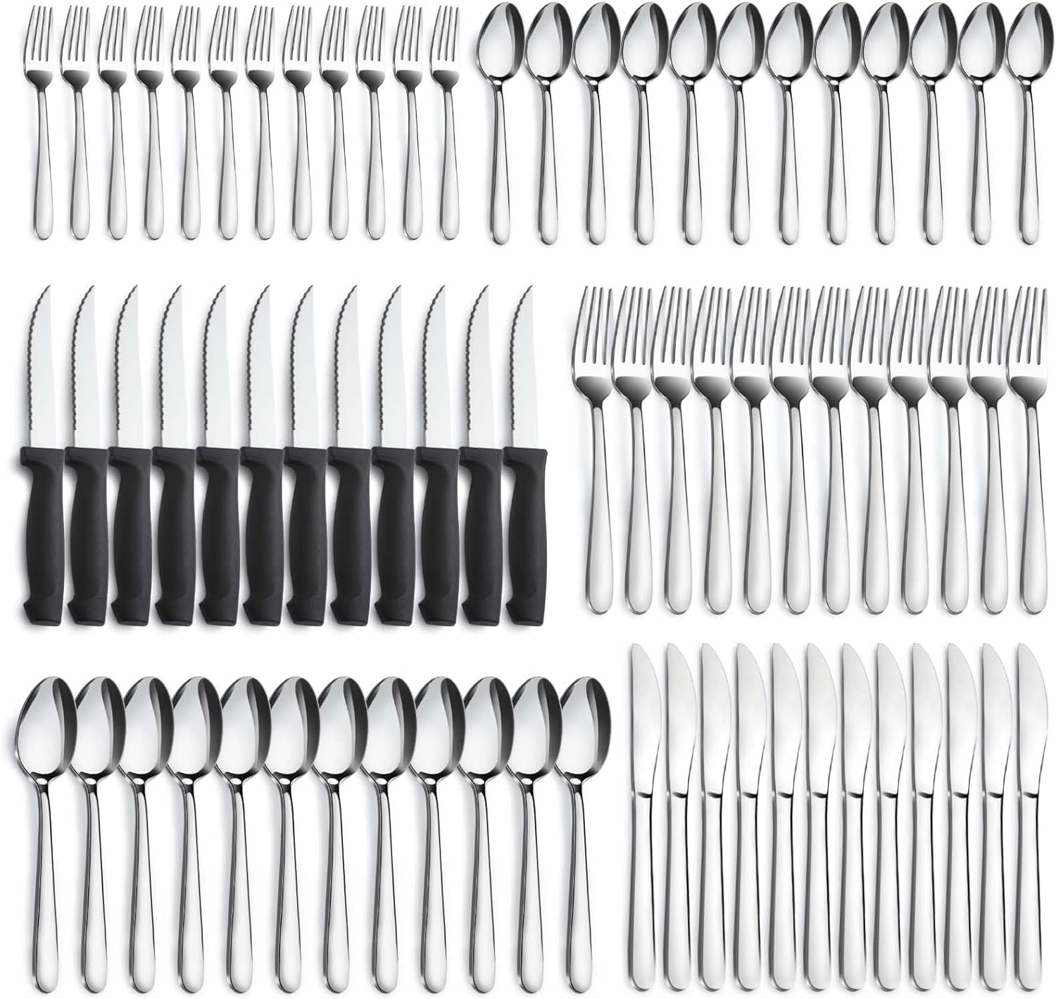 - 【72-Pieces Flatware Set For 12】Our 72 pieces silverware set contains 12 dinner spoons, 12 teaspoons, 12 dinner forks, 12 salad forks, 12 dinner knives and 12 extra steak knives, so you don't have to buy steak knives separately. The cutlery set is also an irreplaceable dining tool whether it is for daily use or for preparing dinners or parties